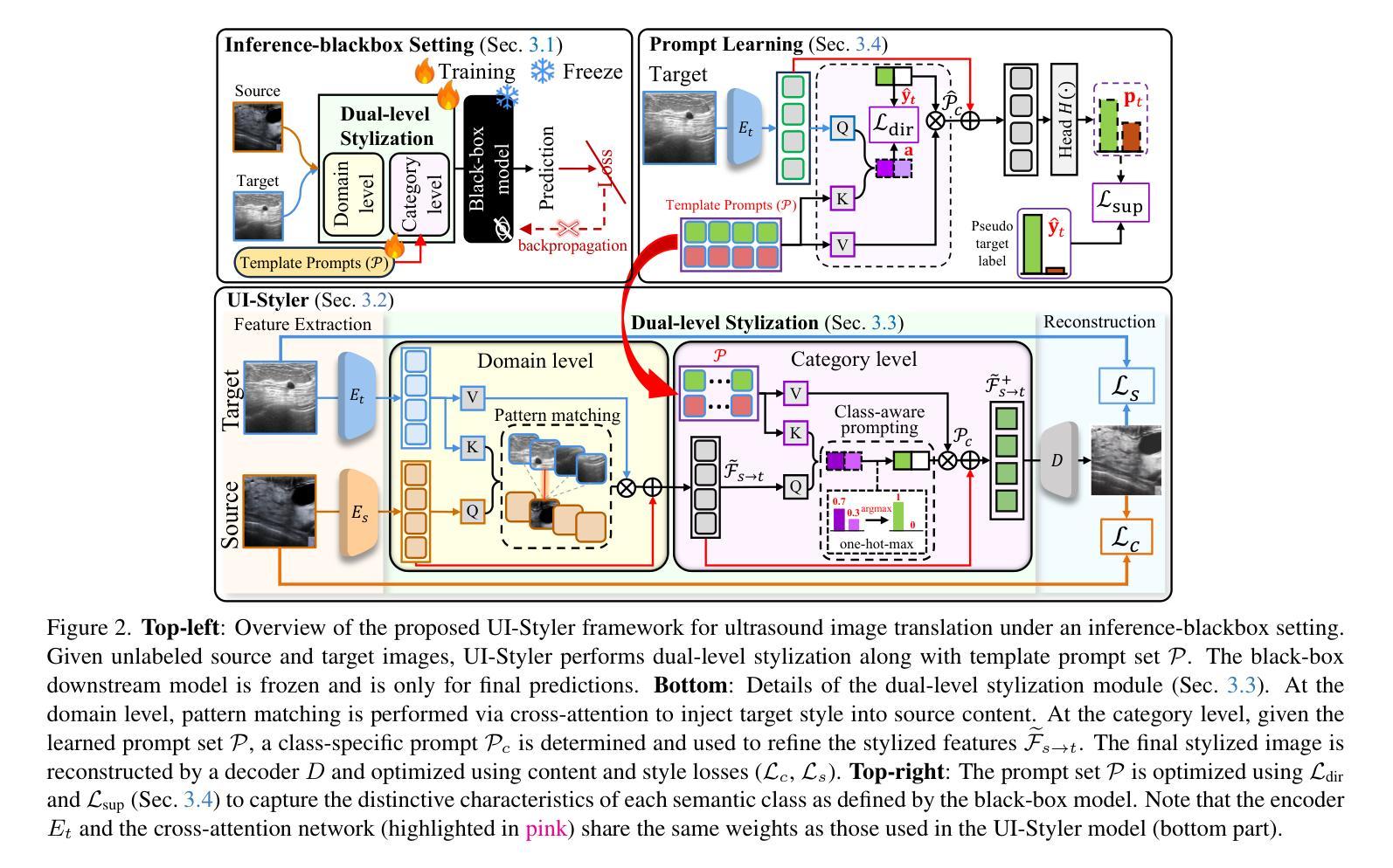 超声图像的外观因采集设备而异,导致领域偏移,当重复使用固定的黑箱下游推理模型时,会降模型的性能。为了缓解这一问题,开发无需配对图像翻译(UIT)方法是非常实用的,该方法可以有效地对齐源域和目标域之间的统计分布,特别是在重复使用的推理黑箱设置的约束下。然而,现有的UIT方法在进行领域适应时往往忽略了类特定的语义对齐,导致内容类映射错位,从而损害诊断准确性。为了解决这一局限性,我们提出了UI-Styler,这是一个新颖的超声特定、类感知的图像风格转移框架。UI-Styler利用模式匹配机制,将目标图像中的纹理模式转移到源图像上,同时保留源结构内容。此外,我们引入了由目标域的伪标签引导的类感知提示策略,这强制与诊断类别进行准确语义对齐。在超声跨设备任务上的大量实验表明,UI-Styler持续优于现有的UIT方法,在分布距离和下游任务(如分类和分割)上达到了最新性能。