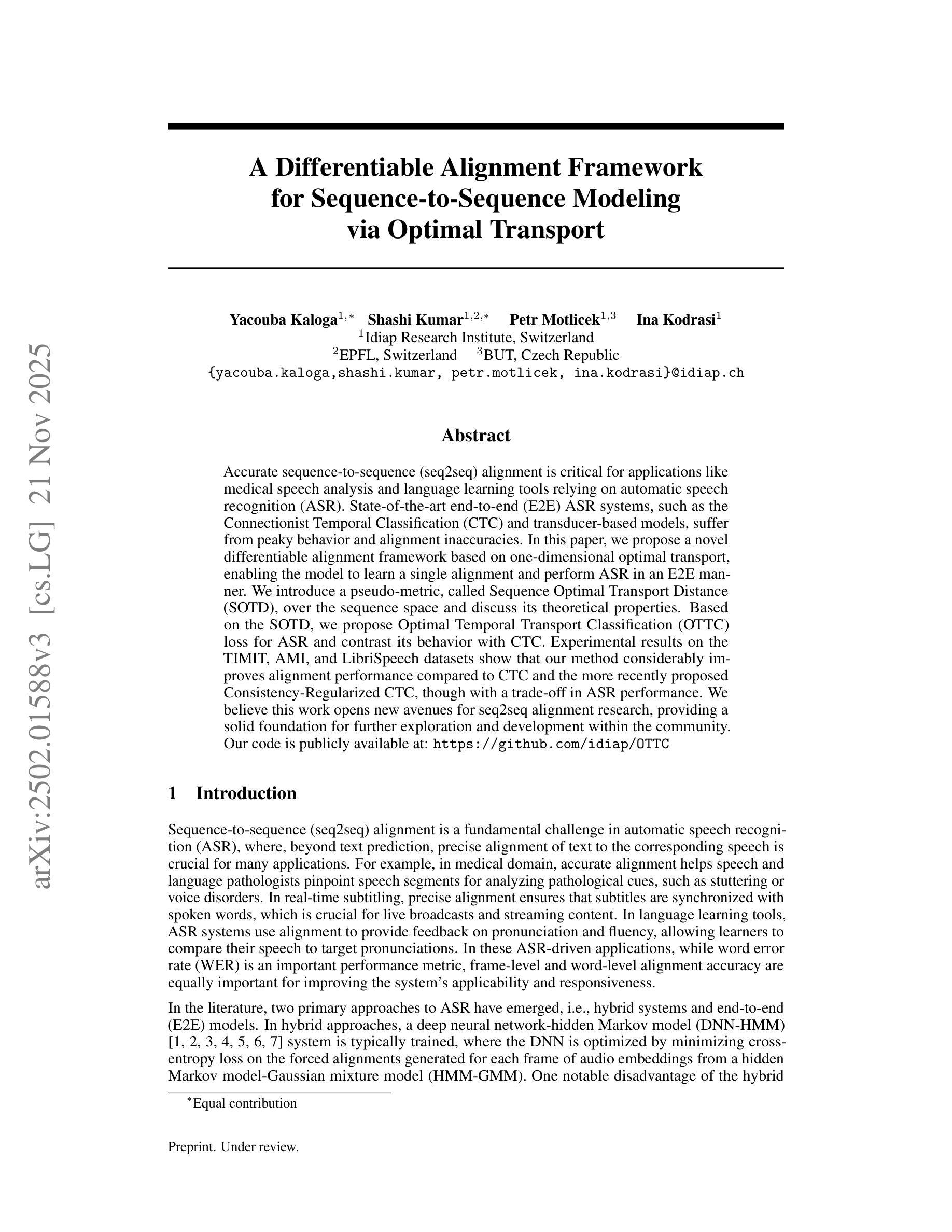 精确序列到序列(seq2seq)对齐对于依赖自动语音识别(ASR)的应用至关重要,例如医疗语音分析和语言学习工具。目前最先进的端到端(E2E)ASR系统,如连接时序分类(CTC)和基于转换器模型的系统,存在尖峰行为和对齐不准确的问题。在本文中,我们提出了一种基于一维最优传输的新型可区分对齐框架,使模型能够以端到端的方式学习单一对齐并执行ASR。我们引入了序列空间上的伪度量,称为序列最优传输距离(SOTD),并讨论了其理论特性。基于SOTD,我们提出了用于ASR的最优时序传输分类(OTTC)损失,并将其行为与CTC进行了对比。在TIMIT、AMI和LibriSpeech数据集上的实验结果表明,我们的方法在改善对齐性能方面与CTC和最近提出的一致性正则化CTC相比具有显著优势,尽管在ASR性能方面存在权衡。我们相信这项工作为seq2seq对齐研究开辟了新途径,为社区内的进一步探索和发展提供了坚实的基础。我们的代码可在https://github.com/idiap/OTTC公开访问。