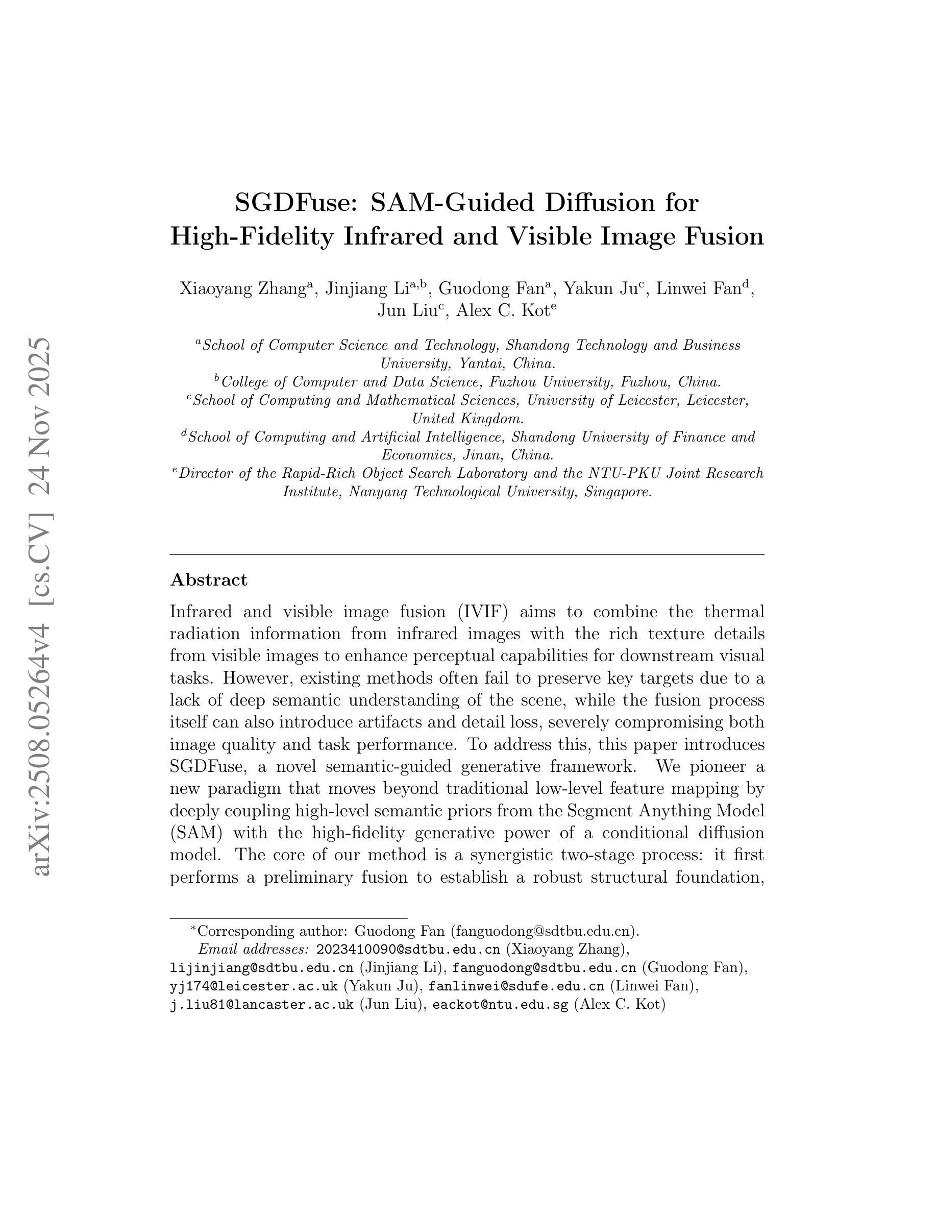红外与可见图像融合技术结合红外图像的热辐射信息与可见图像丰富的纹理细节,以提高下游视觉任务的感知能力。为克服现有方法因缺乏深度语义理解而难以保留关键目标的问题,以及融合过程引入伪影和细节损失等缺陷,本文提出SGDFuse方法。该方法以Segment Anything Model(SAM)生成的语义掩膜作为先验知识,指导融合过程的优化,通过条件扩散模型实现高质量、语义感知的图像融合。实验表明,SGDFuse在主观和客观评估以及下游任务适应性方面均达到最佳性能,为解决图像融合的核心挑战提供了有力解决方案。