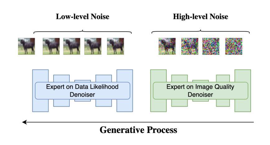 - 在高噪声水平时使用图像质量专家塑造全局结构,然后在低噪声水平时切换到概率专家优化像素统计。