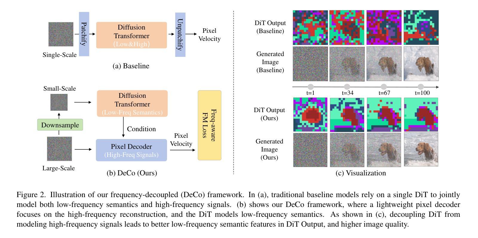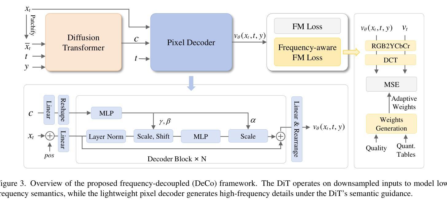 - 该框架利用轻量级像素解码器生成高频细节,同时使扩散变压器(DiT)专注于低频语义建模。