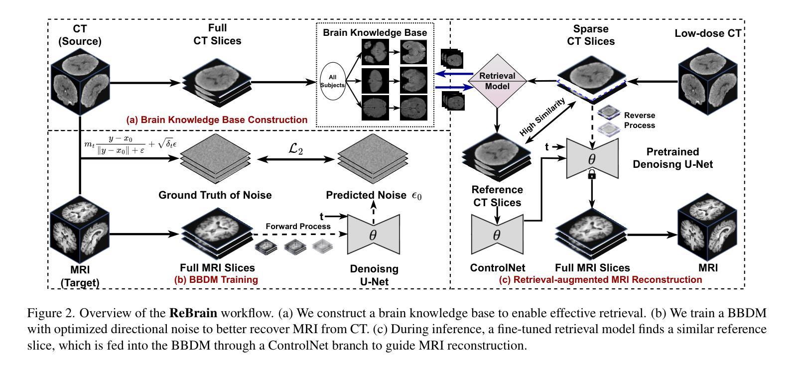 - ReBrain结合了布朗桥扩散模型(BBDM)来合成MRI切片,并采用精细调整的检索模型来检索类似CT切片作为参考。