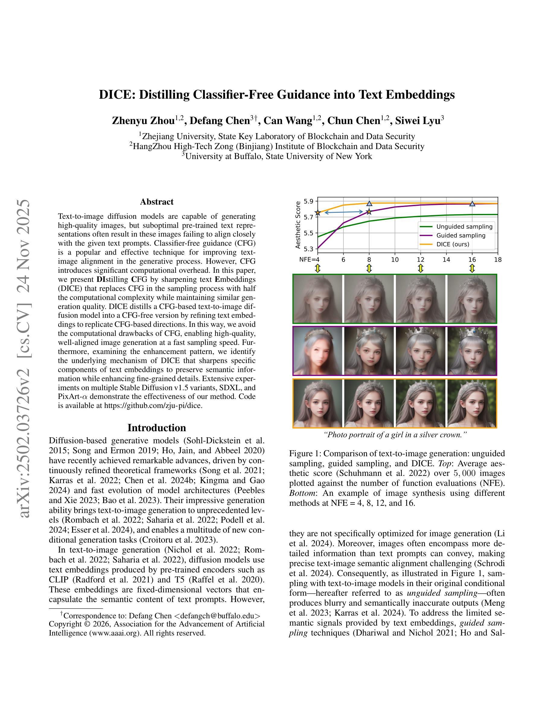 文本到图像的扩散模型能生成高质量图像,但预训练文本表示不佳常导致图像与文本提示不符。无分类器引导(CFG)技术可改善生成过程中的文本图像对齐问题,但引入较大计算开销。本文提出通过精炼文本嵌入来提炼CFG(DICE)的方法,用减半的计算复杂度在采样过程中替代CFG,同时保持相似的生成质量。DICE将基于CFG的文本到图像扩散模型提炼为无CFG版本,通过精炼文本嵌入复制CFG的方向。这样避免了CFG的计算缺点,实现了快速采样速度下高质量、对齐良好的图像生成。此外,通过分析增强模式,本文确定了DICE的基础机制,即精炼文本嵌入的特定部分以保留语义信息并增强细节。在多个Stable Diffusion v1.5变体、SDXL和PixArt-α上的广泛实验证明了该方法的有效性。代码可通过https://github.com/zju-pi/dice获取。