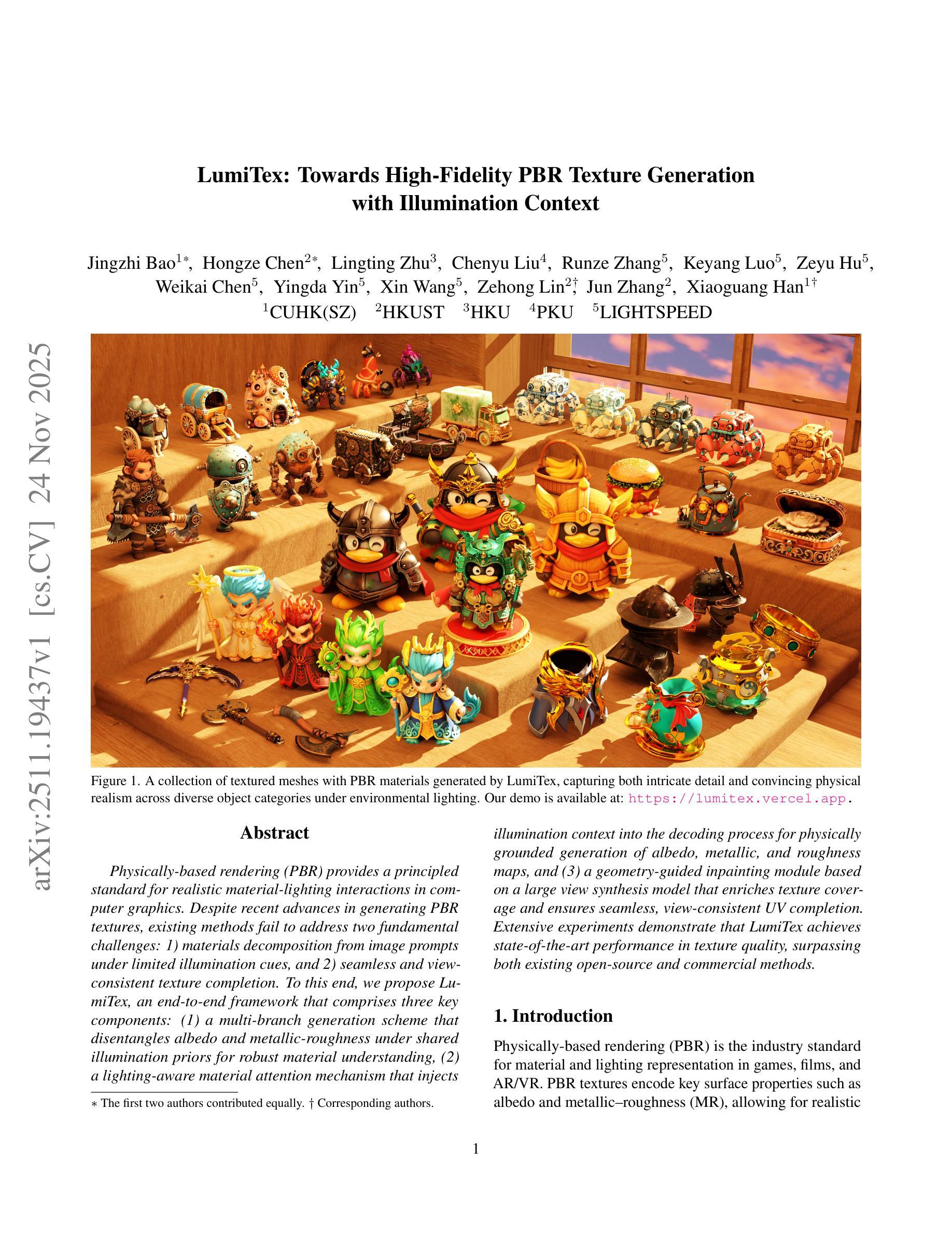 基于物理的渲染(PBR)为计算机图形中的真实材质与灯光交互提供了一个原则性的标准。尽管在生成PBR纹理方面取得了最新进展,但现有方法仍然无法解决两个基本挑战:1)在有限的照明提示下从图像提示中进行材料分解;2)无缝且视角一致的纹理补全。为此,我们提出了LumiTex,这是一个包含三个关键组件的端到端框架:(1)一种多分支生成方案,通过共享照明先验来分解亮度和金属粗糙度,以实现稳健的材料理解;(2)一种照明感知材料注意力机制,将照明上下文注入解码过程中,以生成基于物理的亮度、金属和粗糙度图;(3)基于大型视图合成模型的几何引导填充模块,丰富纹理覆盖并确保无缝、视角一致的UV补全。大量实验表明,LumiTex在纹理质量方面达到了最新技术水平,超越了现有的开源和商业方法。