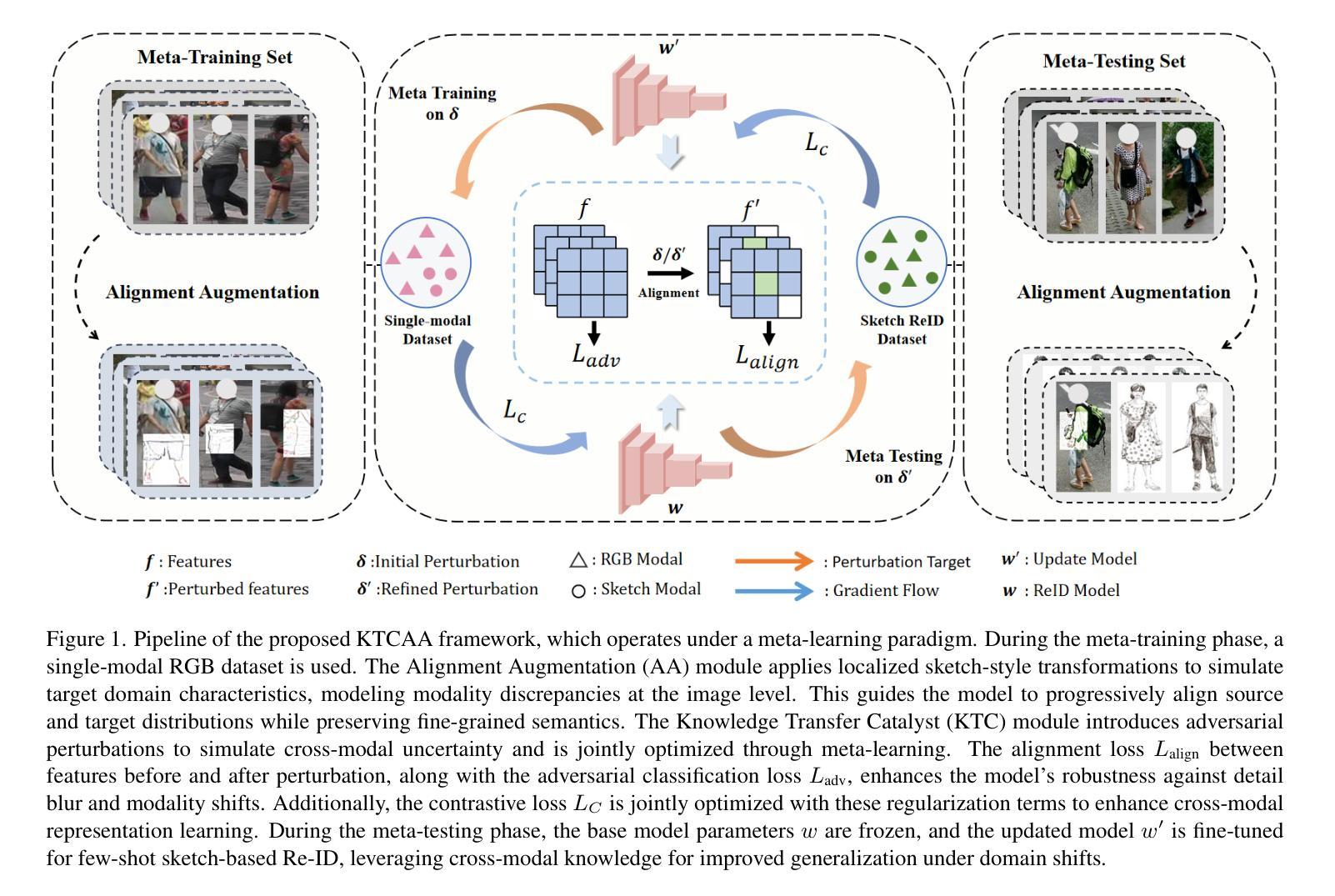 基于草图的人体再识别旨在将手绘草图与RGB监控图像进行匹配,但由于存在明显的模态差异和标注数据有限,仍然具有挑战性。为了解决这一问题,我们引入了KTCAA,这是一个用于小样本跨模态泛化的理论框架。受泛化理论的启发,我们确定了影响目标域风险的两个关键因素:(1) 域差异,它量化了源分布和目标分布之间的对齐难度;(2) 扰动不变性,它评估了模型对模态变化的鲁棒性。基于这些见解,我们提出了两个组件:(1) 对齐增强(AA),它应用局部草图风格转换来模拟目标分布,促进渐进对齐;(2) 知识转移催化剂(KTC),它通过引入最坏情况扰动和强制执行一致性来提高不变性。这些模块在元学习范式下联合优化,将来自数据丰富的RGB域的对齐知识转移到基于草图的场景。在多个基准测试上的实验表明,KTCAA达到了最先进的性能,特别是在数据稀缺的条件下。