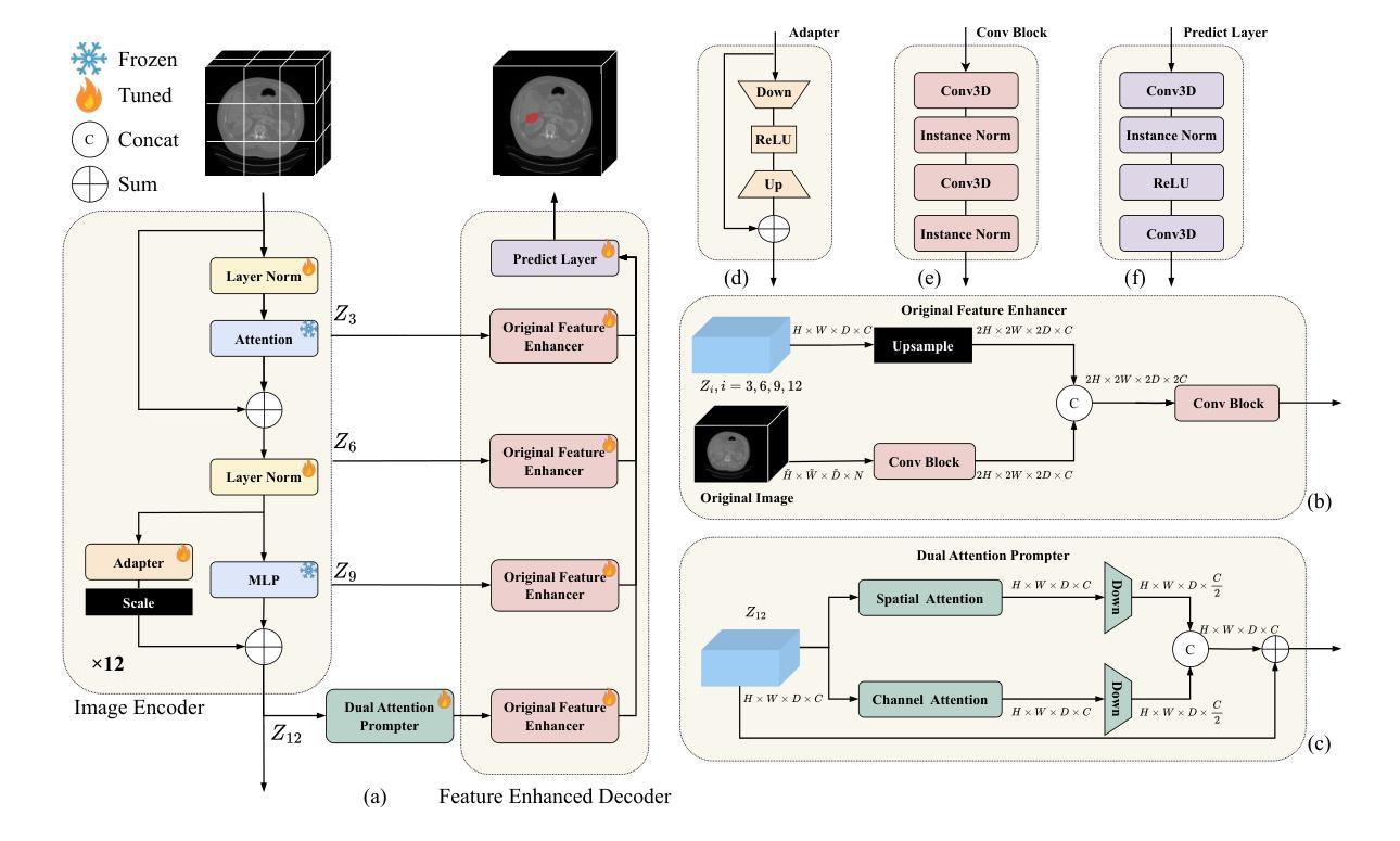 SAM模型在医学图像分割中展现出巨大潜力,但其在3D图像处理上存在空间特征损失的问题,且多数方法仍依赖手动提示,难以实现实际应用。为解决这些问题,提出DEAP-3DSAM模型,通过特征增强解码器融合原始图像特征与丰富的空间信息,以及通过双注意力提示器自动获取提示信息。在四个公共腹部肿瘤分割数据集上的实验表明,DEAP-3DSAM在3D图像分割上达到最新性能水平。