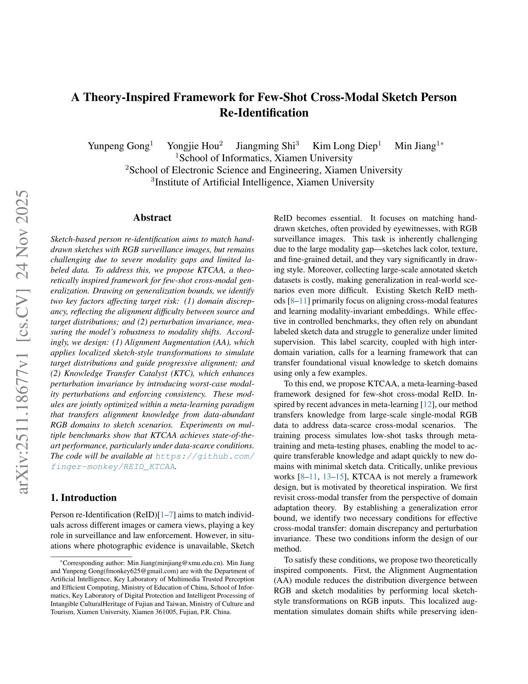 Sketch based person re-identification aims to match hand-drawn sketches with RGB surveillance images, but remains challenging due to significant modality gaps and limited annotated data. To address this, we introduce KTCAA, a theoretically grounded framework for few-shot cross-modal generalization. Motivated by generalization theory, we identify two key factors influencing target domain risk: (1) domain discrepancy, which quantifies the alignment difficulty between source and target distributions; and (2) perturbation invariance, which evaluates the model’s robustness to modality shifts. Based on these insights, we propose two components: (1) Alignment Augmentation (AA), which applies localized sketch-style transformations to simulate target distributions and facilitate progressive alignment; and (2) Knowledge Transfer Catalyst (KTC), which enhances invariance by introducing worst-case perturbations and enforcing consistency. These modules are jointly optimized under a meta-learning paradigm that transfers alignment knowledge from data-rich RGB domains to sketch-based scenarios. Experiments on multiple benchmarks demonstrate that KTCAA achieves state-of-the-art performance, particularly in data-scarce conditions.