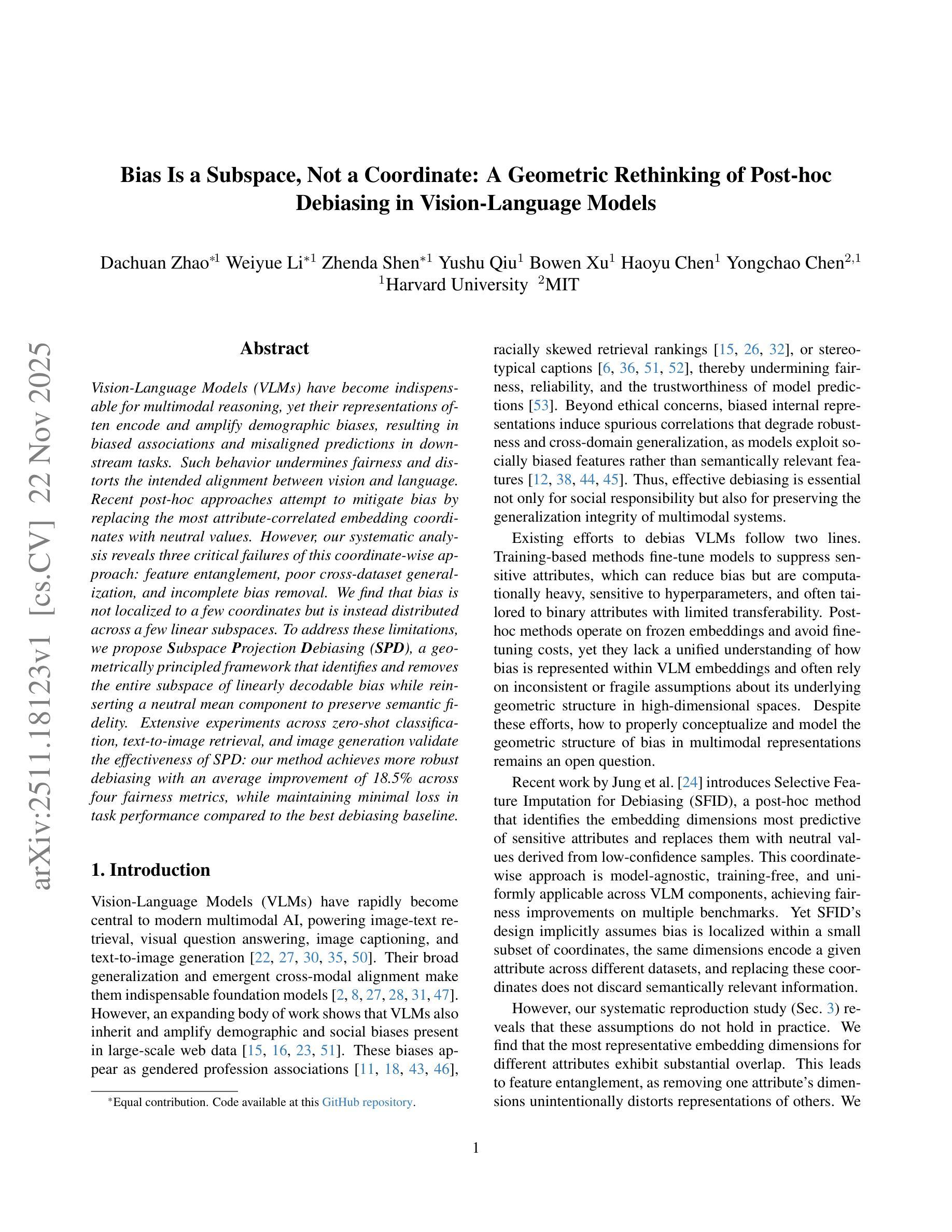 视觉语言模型(VLMs)在多模态推理中不可或缺,但其表示常常编码和放大人口偏见,导致下游任务中的偏见关联和预测失误。新出现的后处理方法试图通过替换最具属性相关的嵌入坐标来减少偏见。然而,系统分析发现这种坐标级方法存在三个关键缺陷:特征纠缠、跨数据集泛化性能差和偏见移除不完全。为解决这些问题,提出了子空间投影去偏见(SPD)框架,能够识别并移除线性可解码偏见整个子空间,同时重新插入中性均值成分以保持语义保真性。实验证明SPD方法有效且稳健,在零样本分类、文本到图像检索和图像生成任务中平均提高了四个公平性指标下的表现18.5%,同时与最佳去偏见基线相比任务性能损失最小。
