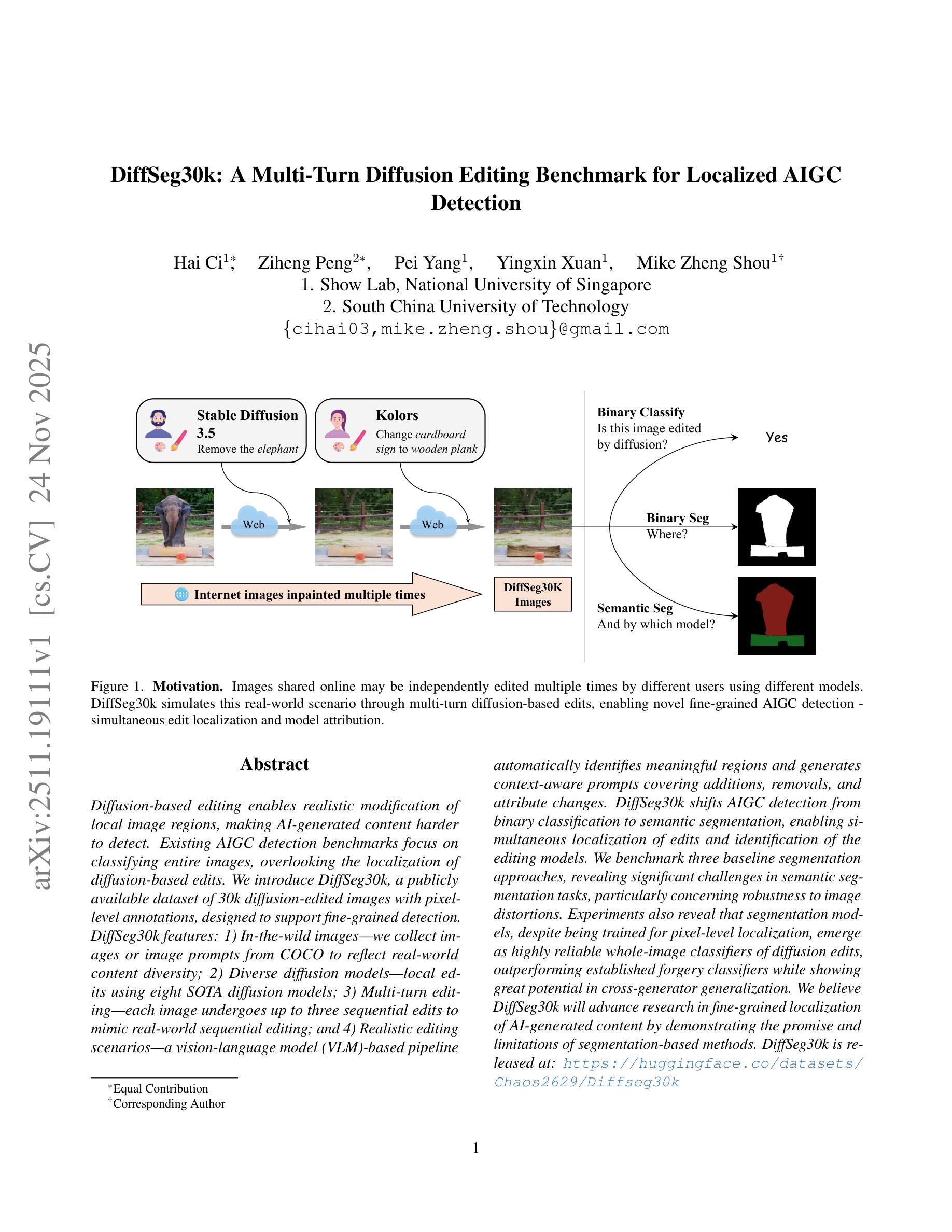 基于扩散的编辑技术能够实现局部图像区域的现实修改,使得AI生成的内容更难被检测。现有的AIGC检测基准测试主要关注对整个图像的分类,忽视了基于扩散的编辑的定位。我们推出了DiffSeg30k,这是一个包含30k个经过扩散编辑的图像的公开数据集,带有像素级注释,旨在支持精细检测。DiffSeg30k的特点包括:1)自然图像——我们从COCO收集图像或图像提示,以反映现实世界的内容多样性;2)多种扩散模型——使用八种先进的扩散模型进行局部编辑;3)多轮编辑——每个图像经历最多三轮连续编辑,以模拟现实世界的连续编辑;4)现实编辑场景——基于视觉语言模型(VLM)的管道会自动识别有意义的区域,并生成涵盖添加、删除和属性更改的上下文感知提示。DiffSeg30k将AIGC检测从二分类转变为语义分割,能够实现编辑的同步定位和编辑模型的识别。我们基准测试了三种分割方法,揭示了语义分割任务中的重大挑战,特别是关于对图像失真的稳健性。实验还表明,尽管经过像素级定位的训练,分割模型却表现出作为整体图像分类器的可靠性,在扩散编辑方面超越了既定的伪造分类器,并在跨生成器泛化方面显示出巨大潜力。我们相信DiffSeg30k将通过展示分割方法的前景和局限性,推动AI生成内容的精细定位研究的发展。DiffSeg30k已在https://huggingface.co/datasets/Chaos2629/Diffseg30k发布。