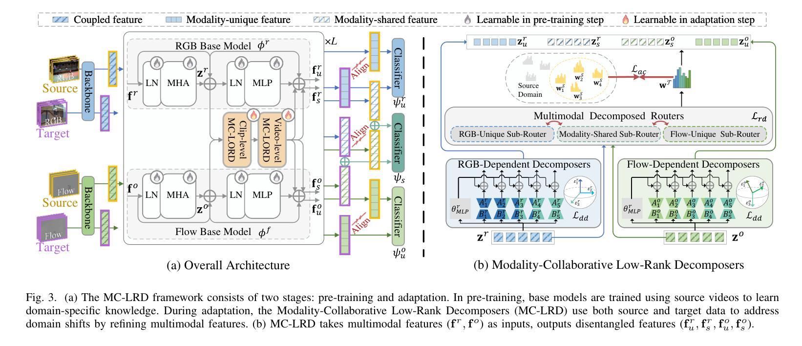 本文研究了小样例视频域自适应(FSVDA)这一具有挑战性的任务。视频的多模态特性带来了独特的挑战,需要在小样例情况下同时考虑域对齐和模态协作,这在以前的文献中是被忽视的。我们观察到,在域迁移的影响下,每个单独模态在目标域上的泛化性能,以及融合的多模态特征的泛化性能受到限制。因为每个模态都由具有不同域迁移的多个组件的耦合特征组成。这种变化增加了域适应的复杂性,从而降低了多模态特征融合的有效性。为了解决这些挑战,我们引入了一种新颖的模态协作低秩分解器(MC-LRD)框架,从每个模态中分解出具有不同域迁移级别的模态特有和模态共享特征,这些特征更利于域对齐。MC-LRD包含针对每个模态的多个分解器以及多模态分解路由器(MDR)。每个分解器在不同模态之间共享参数。利用MDR选择性激活分解器以产生模态特有和模态共享的特征。为了保证有效的分解,我们对分解器和子路由器分别应用了正交去相关性约束,以增强其多样性。此外,我们提出了一种跨域激活一致性损失,以保证同一类别的目标样本和源样本在分解器上具有一致的激活偏好,从而促进域对齐。在三个公共基准测试上的广泛实验结果表明,我们的模型在现有方法的基础上取得了显著的改进。
