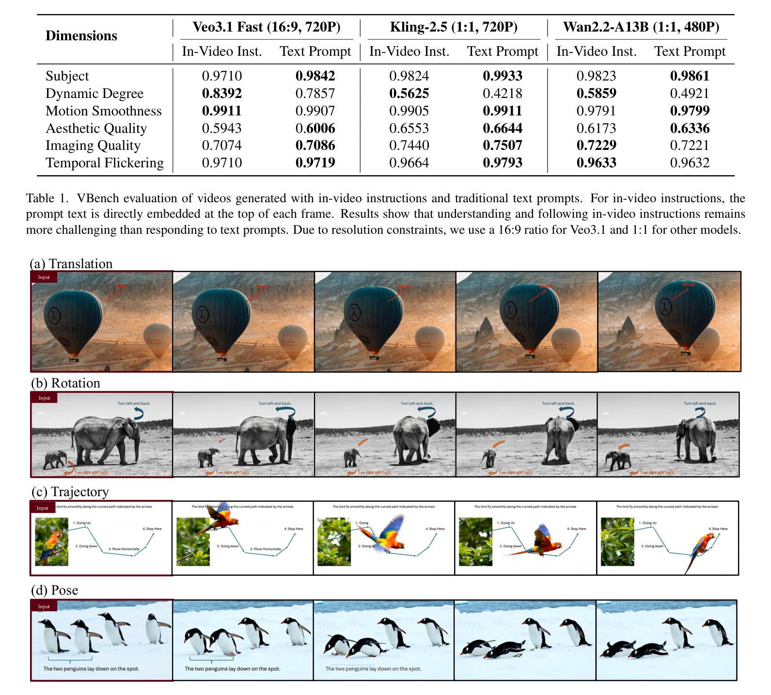 大型视频生成模型展现出强大的视觉能力,能通过当前观察中的逻辑和物理线索预测未来帧。本研究探索是否可利用这些能力进行可控的图像到视频生成,通过解读帧内嵌入的视觉信号作为指令来实现,我们称之为“视频内指令”。与基于提示的控制不同,提示提供的文本描述是全局和粗略的,而视频内指令直接将用户指导编码到视觉领域,通过叠加文本、箭头或轨迹等元素。这为视觉主体及其意图行为之间建立了明确、空间感知和无歧义的联系,为不同对象分配不同的指令。在多个先进生成器上的广泛实验表明,视频模型可以可靠地解释和执行这些视觉嵌入指令,特别是在复杂的多对象场景中。