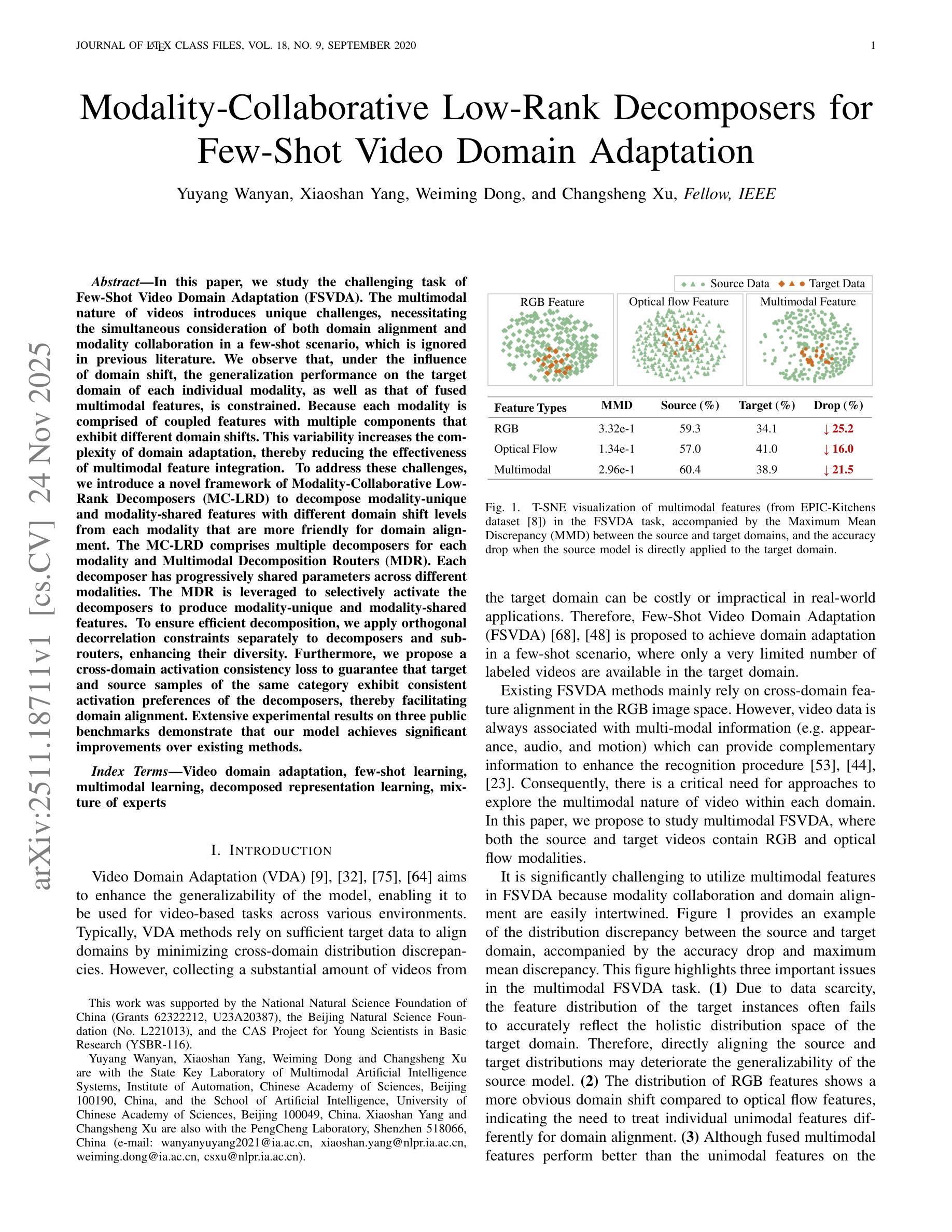 该论文研究少数视频域适应问题(FSVDA)。由于视频的多模态性质引入了独特的挑战,需要在少数场景下同时考虑域对齐和模态协作。在域转移的影响下,目标域中每个独立模态以及融合的多模态特征的泛化性能受到限制。为解决此问题,引入了一个新颖的框架Modality-Collaborative LowRank Decomposers(MC-LRD),通过不同的域转移级别分解模态特有的和模态共享的特征,更加适应域对齐。此外,论文提出了跨域激活一致性损失以确保同类目标样本与源样本具有一致的激活偏好,从而促进域对齐。实验结果表明,该模型在三个公共基准测试中取得了显著的改进。