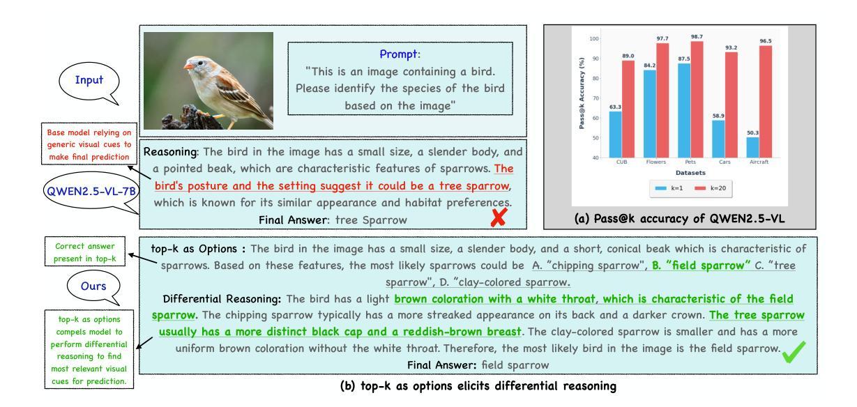 大型视觉语言模型(LVLMs)在细粒度图像识别方面存在困难,难以区分视觉相似的类别。现有使用强化学习(RL)的微调方法常常过于脆弱,鼓励对训练类别的记忆,而无法激发所需的区别推理来实现对未见类别的泛化。为此,我们提出了DiVE-k框架,利用模型的前k个预测作为训练信号,进行差异化视觉推理。DiVE-k为每张训练图像创建基于模型前k个输出的多项选择题,并使用RL训练模型选择正确答案。这种方法要求模型在合理选项之间进行精细的差异化推理,并提供可验证的奖励信号,减轻记忆负担,提高泛化能力。在五个标准细粒度数据集上的实验表明,我们的方法显著优于现有方法。