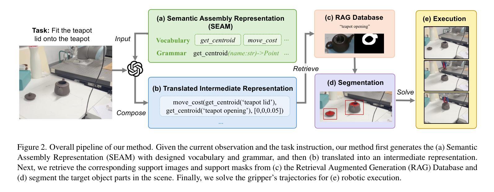 基于上下文无关语法,设计了一种名为SEAM的语义装配表示方法,通过将中间表示分解为词汇和语法,实现了在机器人操作中的视觉语言模型(VLM)的简洁词汇和语义丰富的操作,以及友好的语法处理各种未见任务的能力。此外,提出了一种新的开放词汇分割范式,采用检索增强的少样本学习策略进行精细目标部件的定位和操作,推理时间最短。制定了新的动作泛化性和VLM可理解性的度量标准,并在多个主流表示方法上证明了SEAM在这两个方面的优异性能。大量现实世界实验进一步证明了其在不同设置和任务下的卓越性能。