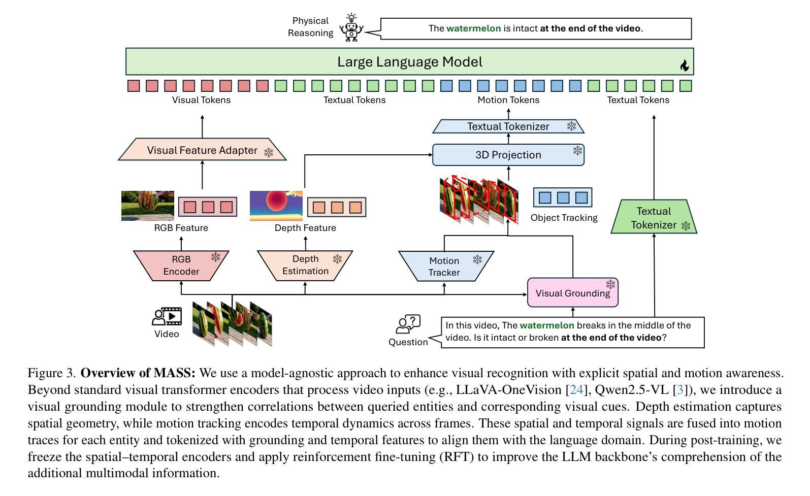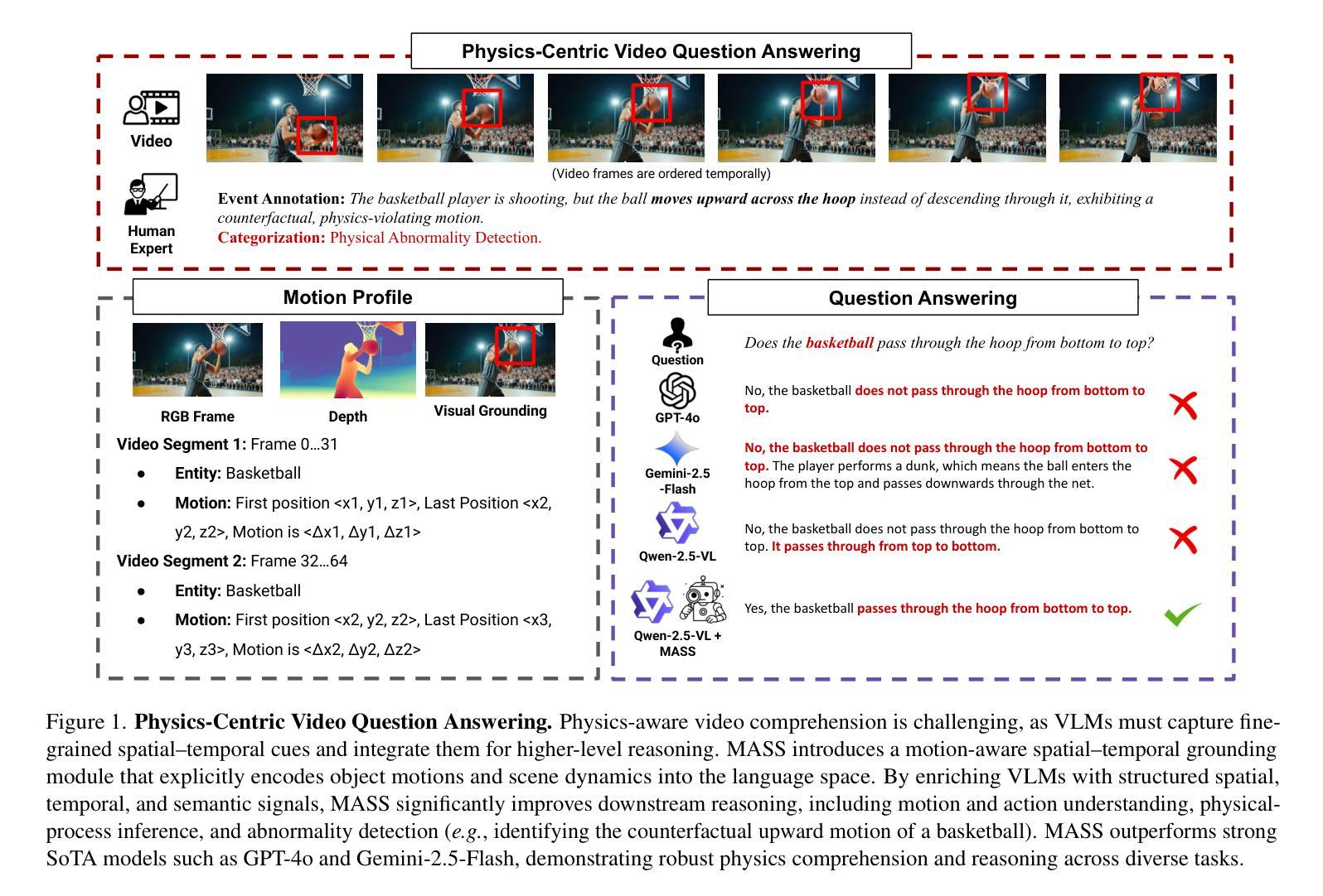 视觉语言模型(VLMs)在标准视频任务上表现良好,但在涉及运动动力学和空间交互的物理驱动推理方面存在困难。这一局限性降低了它们解释真实或AI生成内容(AIGC)视频以及生成物理一致内容的能力。我们提出了一种解决这个问题的方法,通过将物理世界上下文线索翻译成与VLMs感知、理解和推理对齐的可解释表示。我们推出了MASS-Bench,这是一个包含4350个真实世界和AIGC视频以及8361个专注于物理相关理解任务的自由形式视频问答对的综合基准测试,包含详细的注释,包括视觉检测、子段定位和实体全序列3D运动跟踪。我们还推出了MASS,这是一种模型无关的方法,它通过深度为基础的3D编码和视觉定位将时空信号注入VLM语言空间,并配备运动跟踪器进行物体动力学分析。为了加强跨模态对齐和推理,我们应用了强化微调。实验和消融研究结果表明,我们优化后的VLMs比同类和更大的基准模型以及之前的最新模型高出8.7%和6.0%,在物理推理和理解方面达到了与封闭源代码的SoTA VLMs(如Gemini-2.5-Flash)相当的性能,验证了我们的方法的有效性。