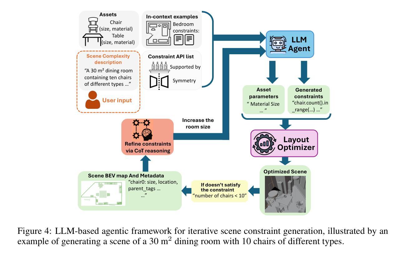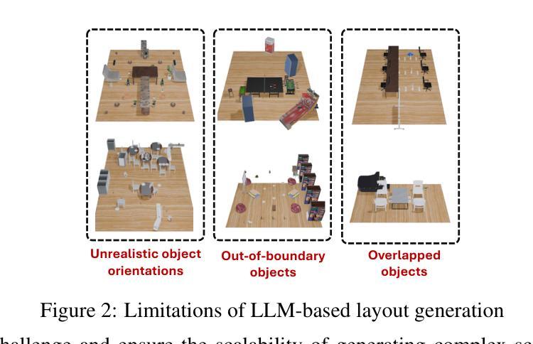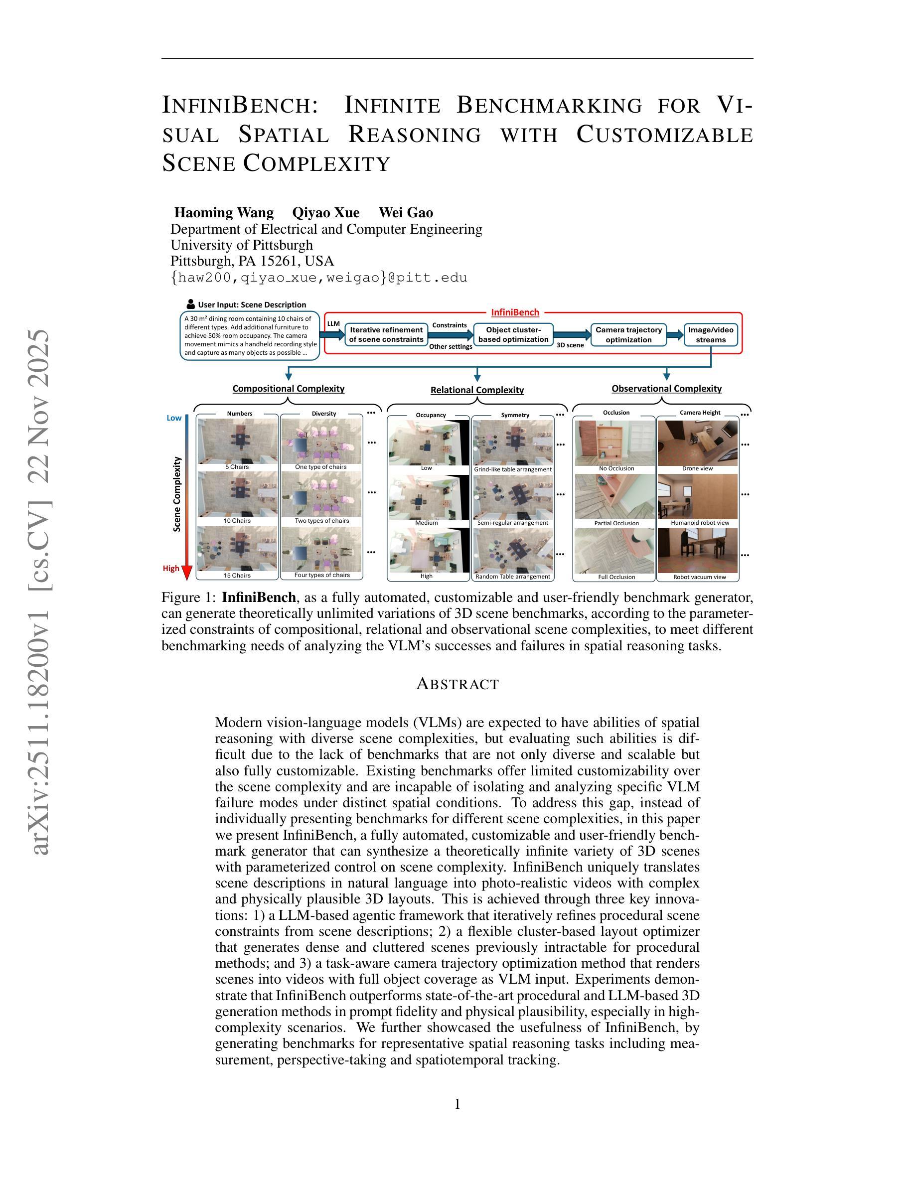 现代视觉语言模型(VLMs)预计会具备处理不同场景复杂度的空间推理能力,但由于缺乏多样化、可扩展且可完全自定义的基准测试,评估这种能力很困难。现有基准测试对场景复杂度的可定制性有限,无法在不同的空间条件下隔离和分析特定的VLM失败模式。为了弥补这一差距,本文并未针对不同场景复杂度分别提供基准测试,而是推出了InfiniBench,这是一个完全自动化、可定制且用户友好的基准测试生成器,可以合成理论上无限种类的3D场景,并通过参数控制场景复杂度。InfiniBench独特地将自然语言描述的场景转化为具有复杂且物理上可行的3D布局的照片级视频。这是通过三个关键创新点实现的:1)基于大型语言模型的代理框架,迭代优化场景描述的程序约束;2)灵活的基于集群的布局优化器,生成之前程序方法无法处理的密集和杂乱场景;3)任务感知的相机轨迹优化方法,将场景渲染成视频,实现VLM输入的全面对象覆盖。实验表明,InfiniBench在提示保真度和物理可行性方面优于最先进的程序化和基于大型语言模型的3D生成方法,尤其是在高复杂度场景中。我们进一步通过为典型的空间推理任务生成基准测试,展示了InfiniBench的实用性,包括测量、视角和时空跟踪。