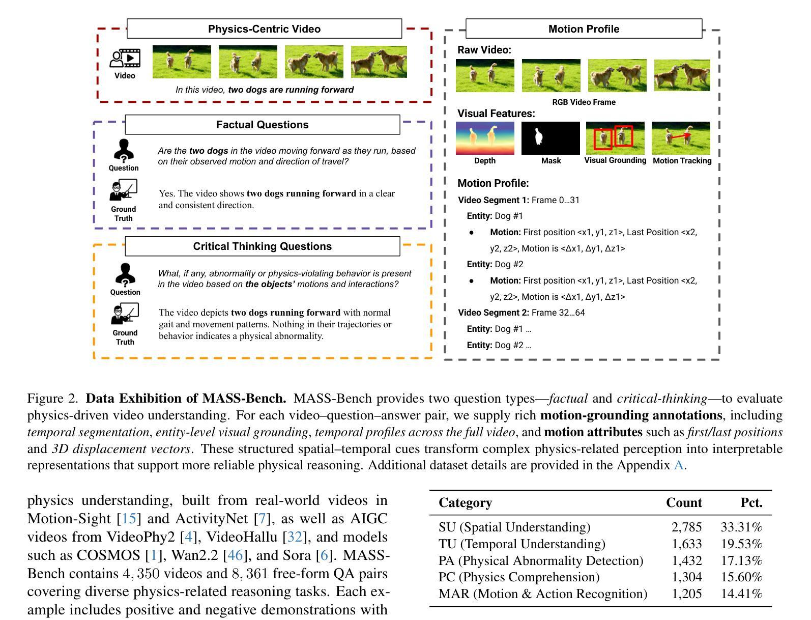 - 引入了MASS-Bench基准测试平台,包含真实和AI生成的视频以及物理理解任务的问答对。