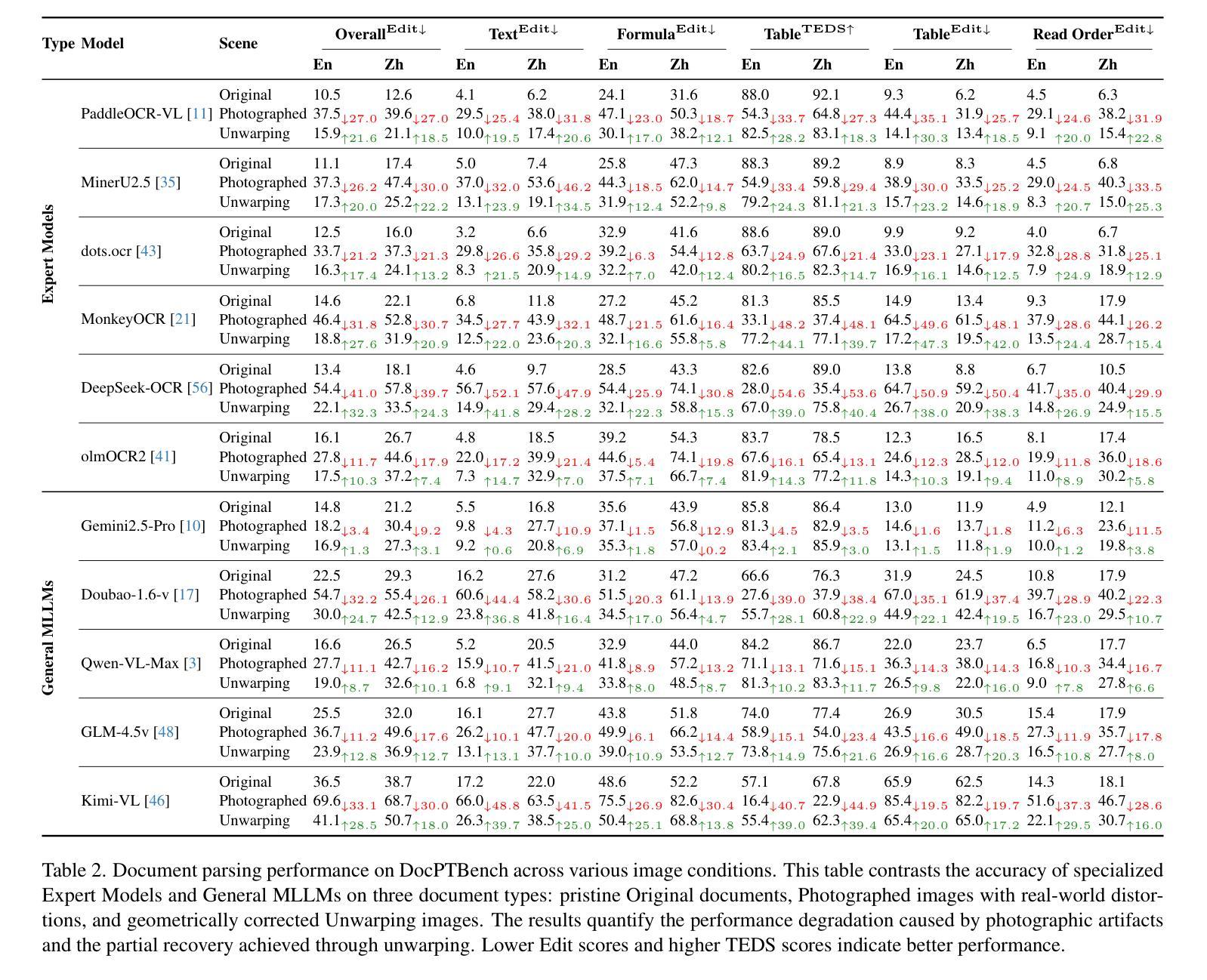 - 专用文档解析模型在面对真实世界捕获的文档时,性能下降更为显著,平均下降25%。