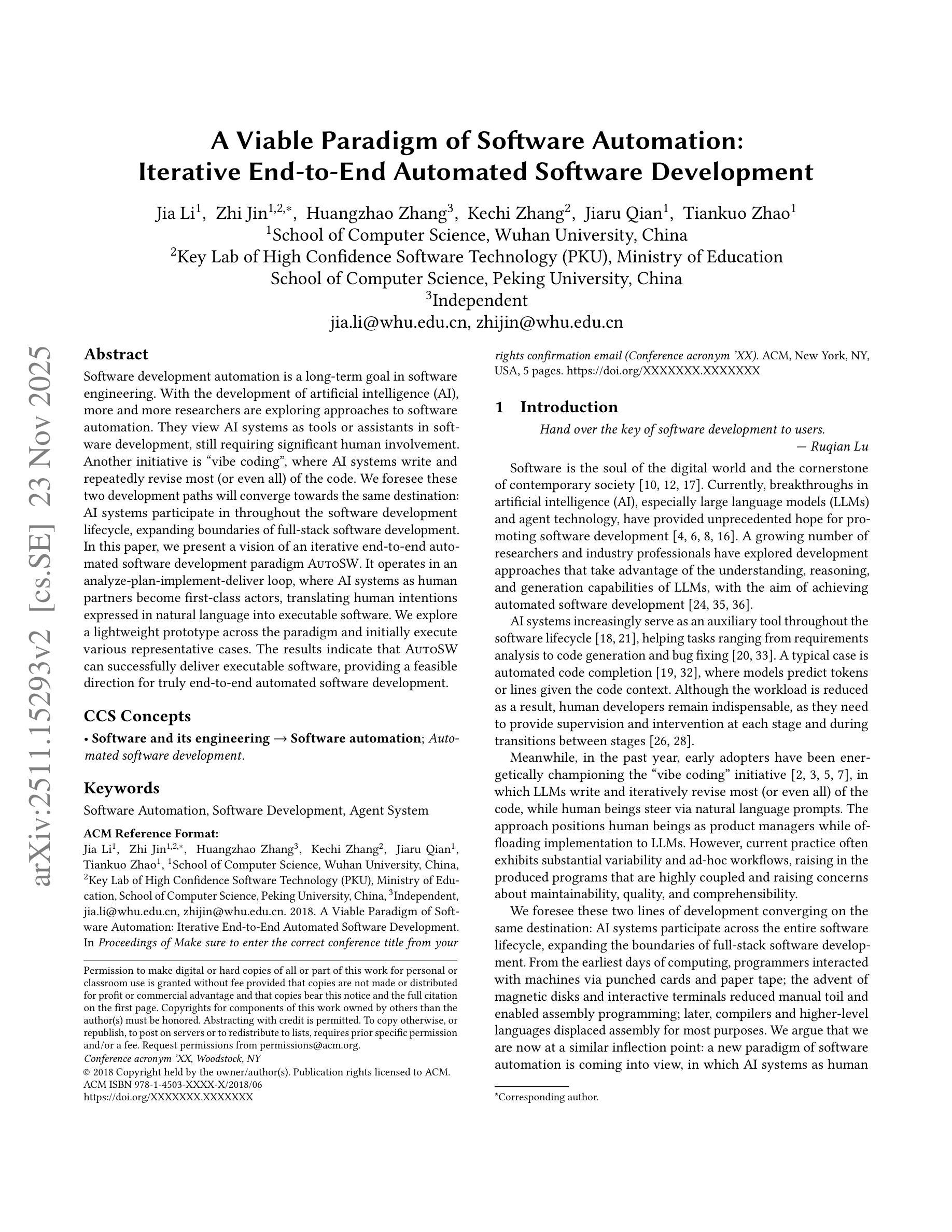 自动化软件开发是软件工程领域的长期目标。随着人工智能(AI)的发展,越来越多的研究者正在探索软件自动化的方法。他们认为AI系统是软件开发中的工具或助手,但仍需要重大的人力投入。另一项倡议是“振动编码”,其中AI系统编写并反复修改大部分(甚至全部)代码。我们预计这两条发展道路将朝着相同的目标发展:AI系统参与整个软件开发生命周期,扩展全栈软件开发的边界。在本文中,我们提出了一个名为AutoSW的迭代端到端自动化软件开发范式。它在分析-计划-实施-交付的循环中运行,其中AI系统作为人类伙伴成为主要参与者,将人类意图通过自然语言转化为可执行软件。我们探索了该范式的轻量级原型并初步执行了各种代表性案例。结果表明,AutoSW能够成功交付可执行软件,为真正的端到端自动化软件开发提供了可行的方向。