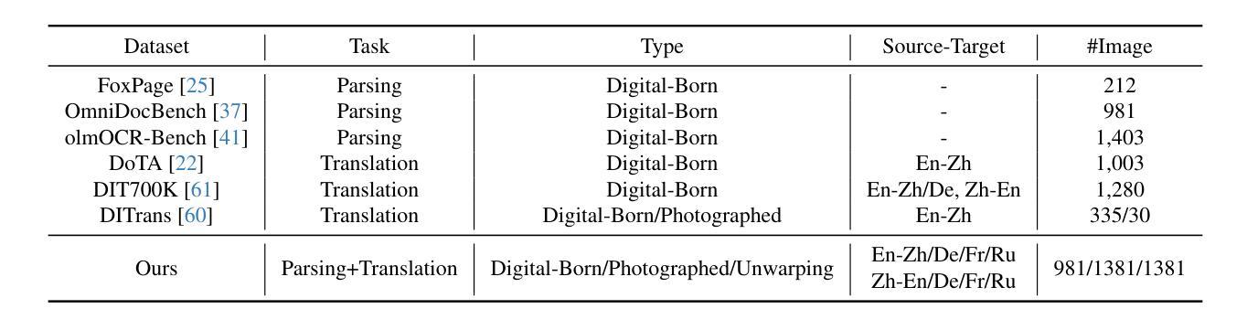- DocPTBench是一个专为拍摄文档解析和翻译设计的综合基准测试。