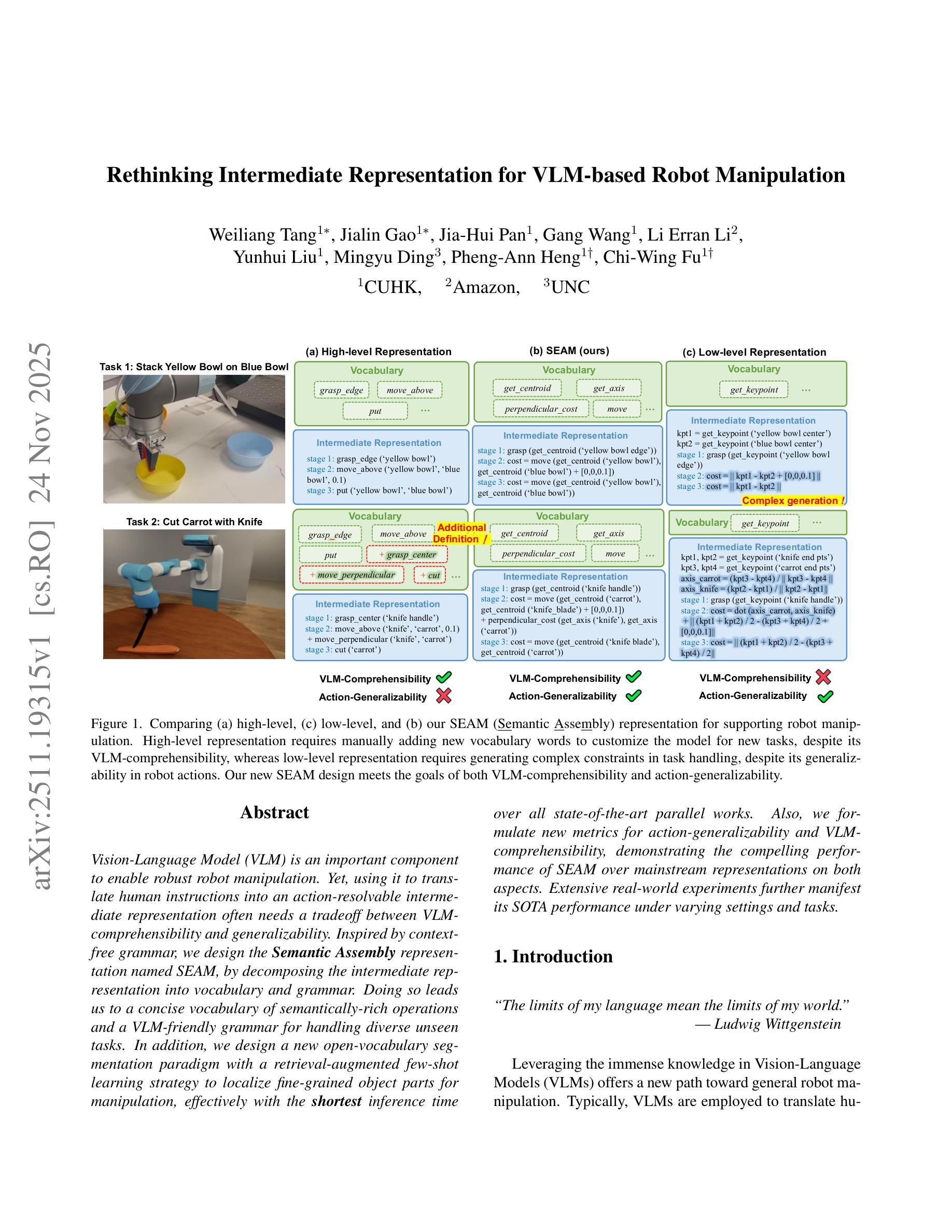 视觉语言模型(VLM)是实现稳健机器人操作的重要组成部分。然而,将其用于将人类指令翻译成可操作的中间表示形式时,往往需要在VLM的可理解性和泛化能力之间进行权衡。受无上下文文法的启发,我们设计了一种名为SEAM的语义装配表示法,通过将中间表示分解为词汇和语法。这样做使我们得到语义丰富的操作简洁词汇,以及一种适用于处理各种未见任务的VLM友好语法。此外,我们设计了一种新的开放词汇分割范式,采用增强检索的少量学习策略来定位精细的物体部分以进行操作,并且在所有最新平行工作中实现了最短的推理时间。我们还制定了动作泛化性和VLM可理解性的新指标,显示了SEAM在各方面的表现均优于主流表现。大量现实世界的实验进一步证明了在各种设置和任务下,其表现均达到最佳水平。