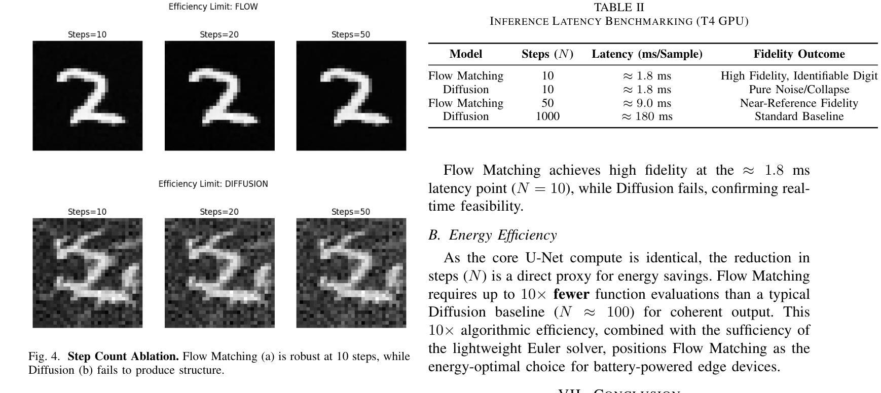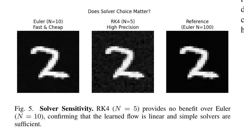 - 通过数值敏感性分析验证,Flow Matching的向量场足够线性,无需使用高阶ODE求解器(如Runge-Kutta 4),使得Euler求解器成为边缘部署的理想选择。