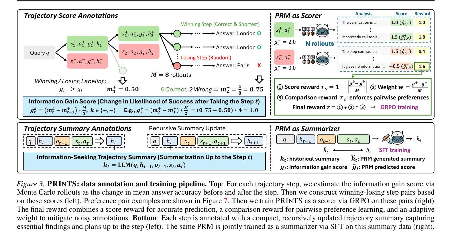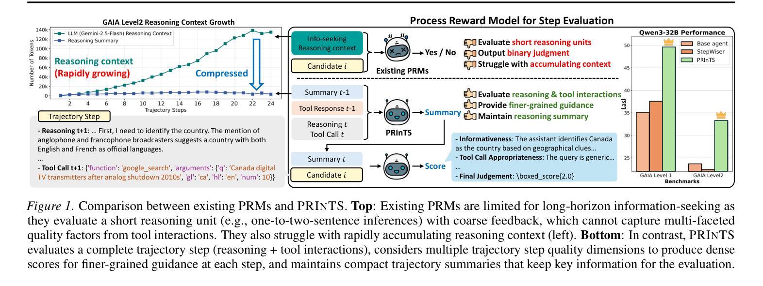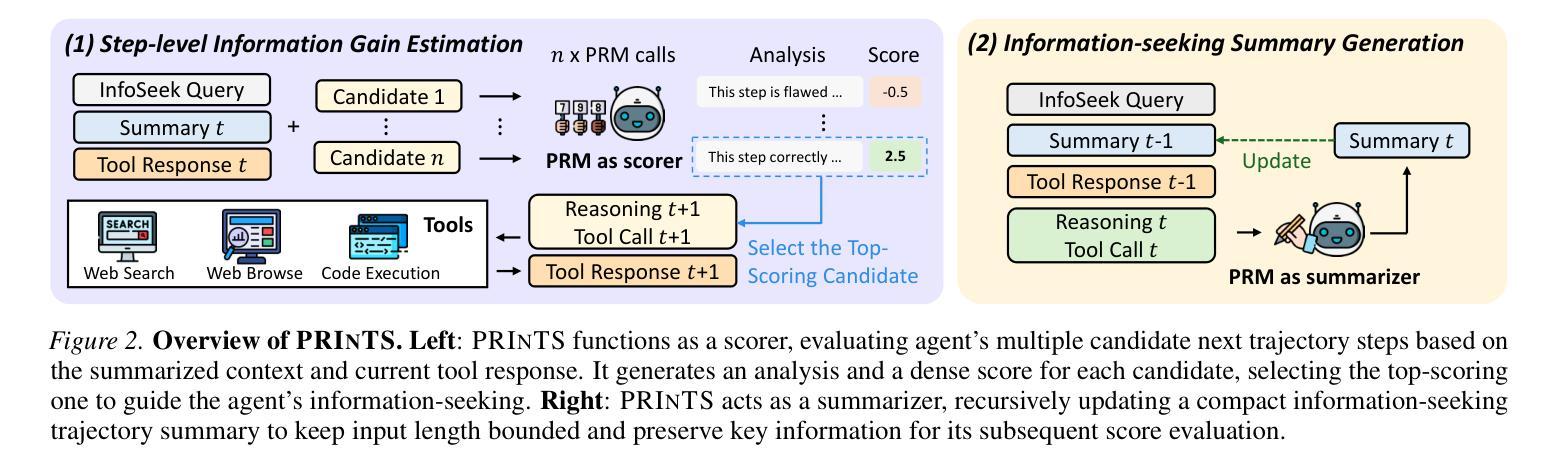 信息搜索是AI代理人的核心能力,要求他们在长时间的轨迹上收集并处理工具生成的信息。然而,对于由语言模型支持的代理人来说,这种多步骤的信息搜索任务仍然具有挑战性。虽然过程奖励模型(PRM)可以通过在测试时对候选步骤进行排名来指导代理人,但现有的PRM是为短期二元判断推理而设计的,无法捕捉信息搜索步骤的丰富维度,如工具交互和处理工具输出,也无法处理长周期任务中迅速增长的上下文。为了解决这些局限性,我们引入了PRInTS,这是一种具有双重能力的生成型PRM:1)基于PRM在多步骤质量维度上的推理进行密集评分(例如,对工具输出的解释、工具调用信息的有用性等);2)轨迹摘要,能够压缩不断增长的上下文,同时保留步骤评估所需的关键信息。在FRAMES、GAIA(1-3级)和WebWalkerQA(简单-困难)基准测试上对多个模型的广泛评估,以及相关的消除实验表明,使用PRInTS的最佳n采样策略提高了开源模型和专用代理的信息搜索能力,在匹配或超越前沿模型性能的同时,具有较小的主干代理,并超越了其他强大的奖励建模基线。