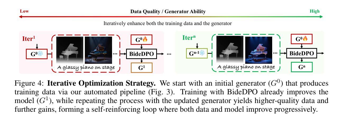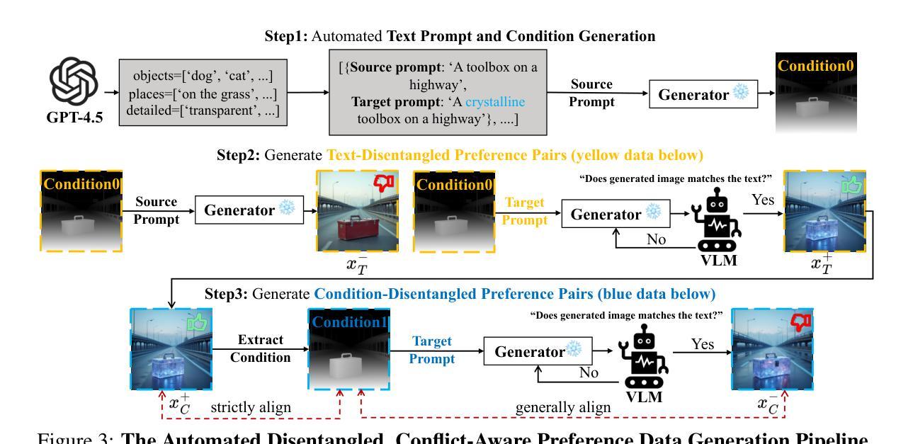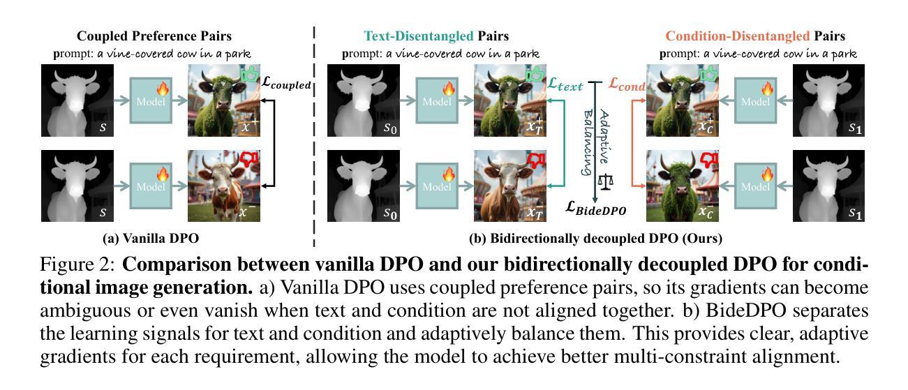 条件图像生成通过结构、空间或风格先验增强了文本到图像的合成。但是,当前的方法在处理各种来源之间的冲突时面临挑战。这些冲突包括:1)输入级别的冲突,即条件图像与文本提示相矛盾;以及2)模型偏见冲突,即使条件与文本匹配,生成偏见也会破坏对齐。解决这些冲突需要微妙的解决方案,而标准的监督微调很难提供这样的解决方案。基于偏好的优化技术(如直接偏好优化(DPO))显示出潜力,但受限于文本和条件信号之间的梯度纠缠以及缺乏多约束任务的解耦训练数据。为了克服这一缺陷,我们提出了双向解耦的DPO框架(BideDPO)。我们的方法创建了两个解耦的偏好对——一个用于条件,一个用于文本——以减少梯度纠缠。使用自适应损失平衡策略来管理配对的影响,以实现平衡优化。我们引入了一个自动化的数据管道来抽样模型输出并生成意识到的冲突数据。这个过程嵌入了一种迭代优化策略中,该策略可以完善模型和数据的精度。我们构建了一个DualAlign基准来评估文本和条件之间的冲突解决情况。实验表明,BideDPO显著提高文本成功率(例如,+35%)并增强了条件遵守性。我们还使用COCO数据集验证了我们的方法。项目页面:https://limuloo.github.io/BideDPO/。