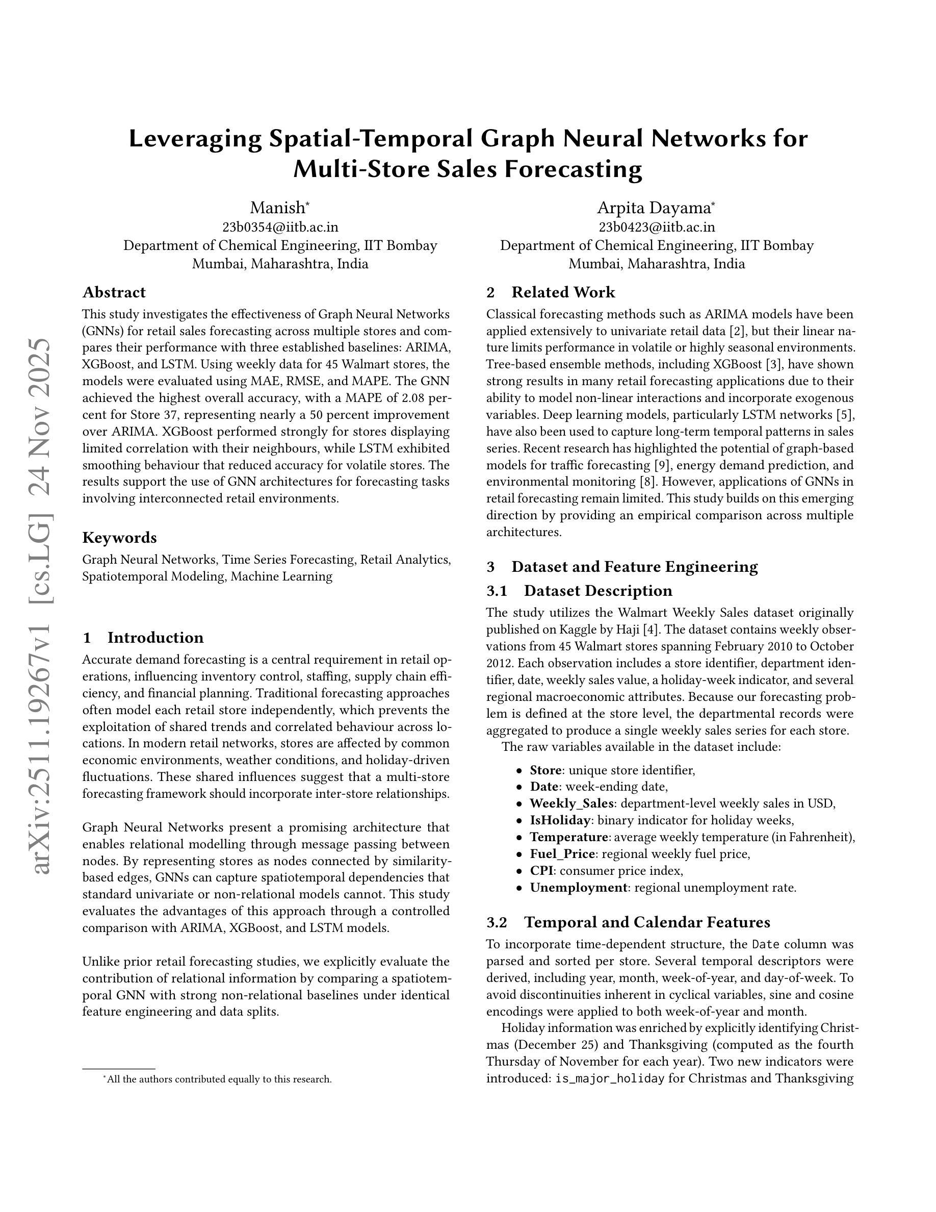 本文评估了时空图神经网络(GNNs)在多店零售销售预测中的有效性,并将其性能与ARIMA、LSTM和XGBoost基线进行了比较。我们使用来自45家沃尔玛商店的每周销售数据,构建了一个关系预测框架,该框架通过自适应学习图对店铺间的依赖关系进行建模。提出的STGNN预测对数差分销售情况,并通过残差路径重建最终值,从而实现稳定的训练和提高泛化能力。实验表明,STGNN的总体预测误差最低,在标准化总绝对误差、P90 MAPE以及各店铺MAPE的方差等各项指标上均优于所有基线方法。对学习的邻接矩阵的分析揭示了有意义的函数型店铺集群和高影响力节点,这些是在没有地理元数据的情况下自然形成的。这些结果表明,关系结构在互联的零售环境中能显著提高预测质量,并确立了STGNN在多店需求预测中的稳健建模选择地位。