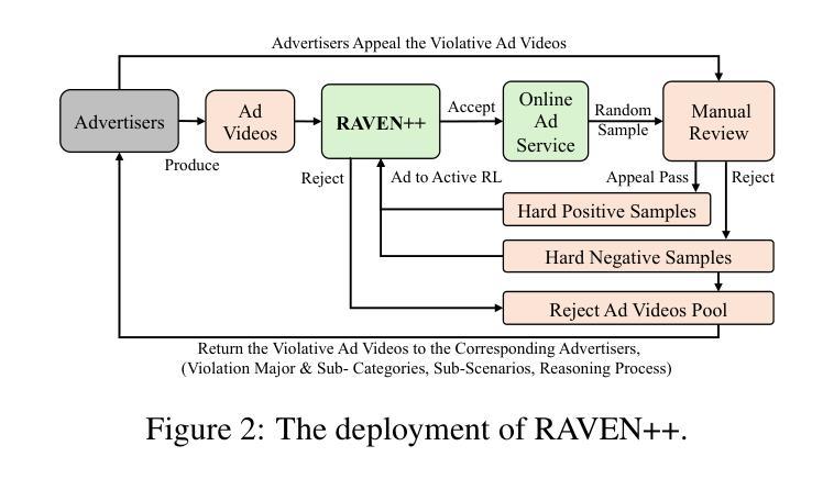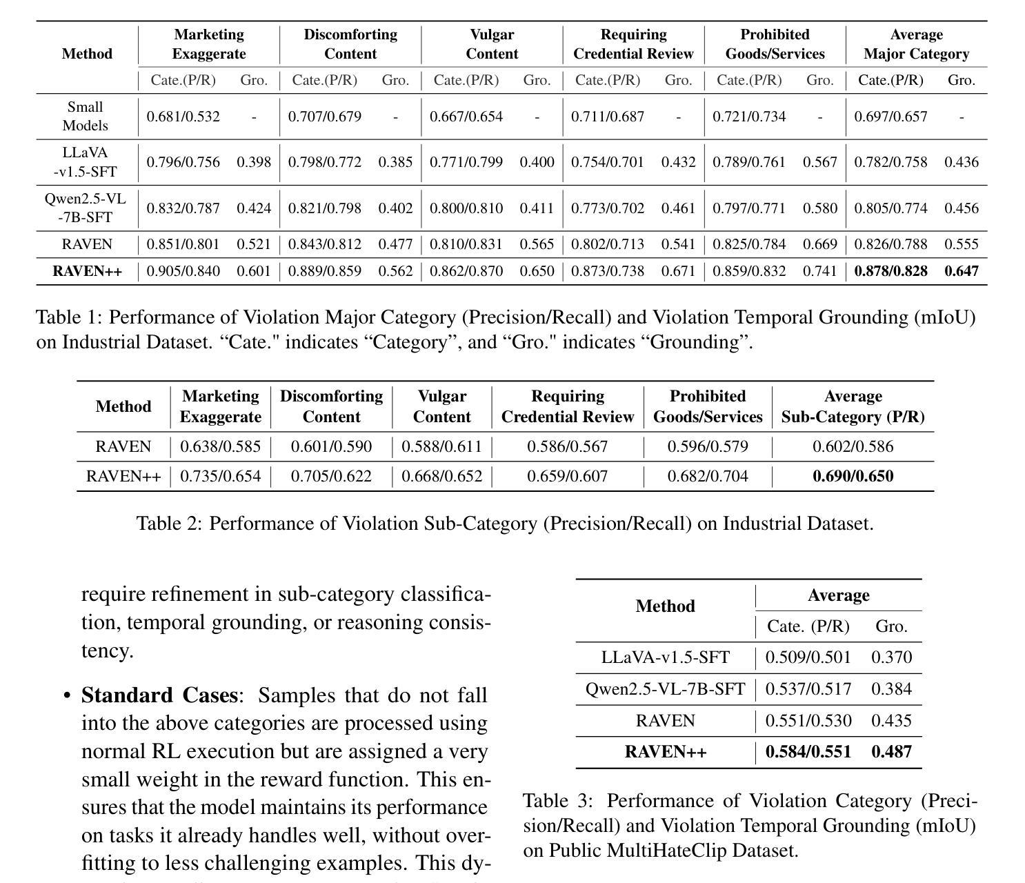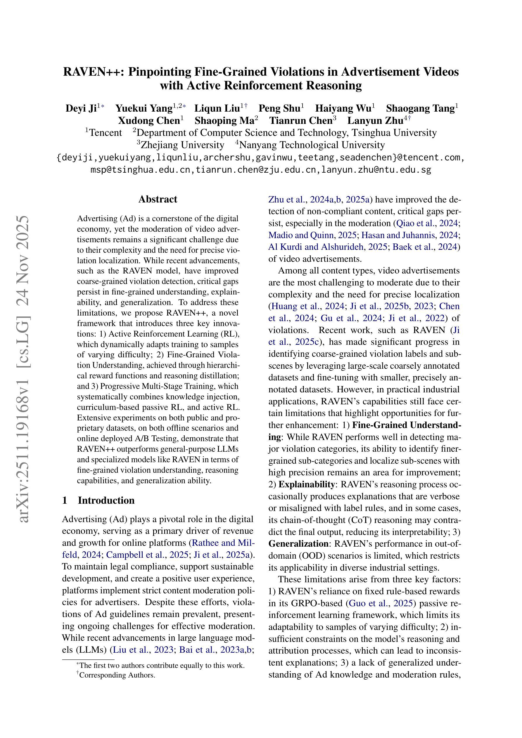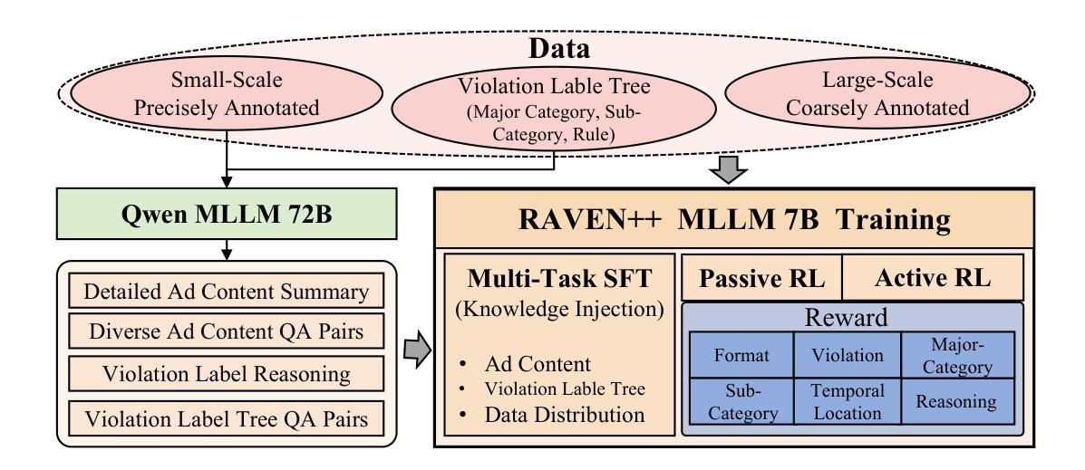 广告(Ad)是数字经济的重要组成部分,但由于其复杂性和对精确违规定位的需求,视频广告的适度控制仍然是一个巨大的挑战。尽管最近的进展,如RAVEN模型,已经改进了粗粒度的违规检测,但在精细粒度理解、解释性和泛化方面仍存在关键差距。为了解决这些局限性,我们提出了RAVEN++,一个引入三项关键创新的新框架:1)主动强化学习(RL),它动态地适应不同难度样本的训练;2)精细粒度的违规理解,通过分层奖励函数和推理蒸馏来实现;以及3)渐进多阶段训练,系统地结合知识注入、基于课程的被动RL和主动RL。在公共和专有数据集上的大量实验,以及在线A/B测试和离线场景下的测试,证明RAVEN++在精细粒度违规理解、推理能力和泛化能力方面优于通用大型语言模型(LLM)和RAVEN等专用模型。