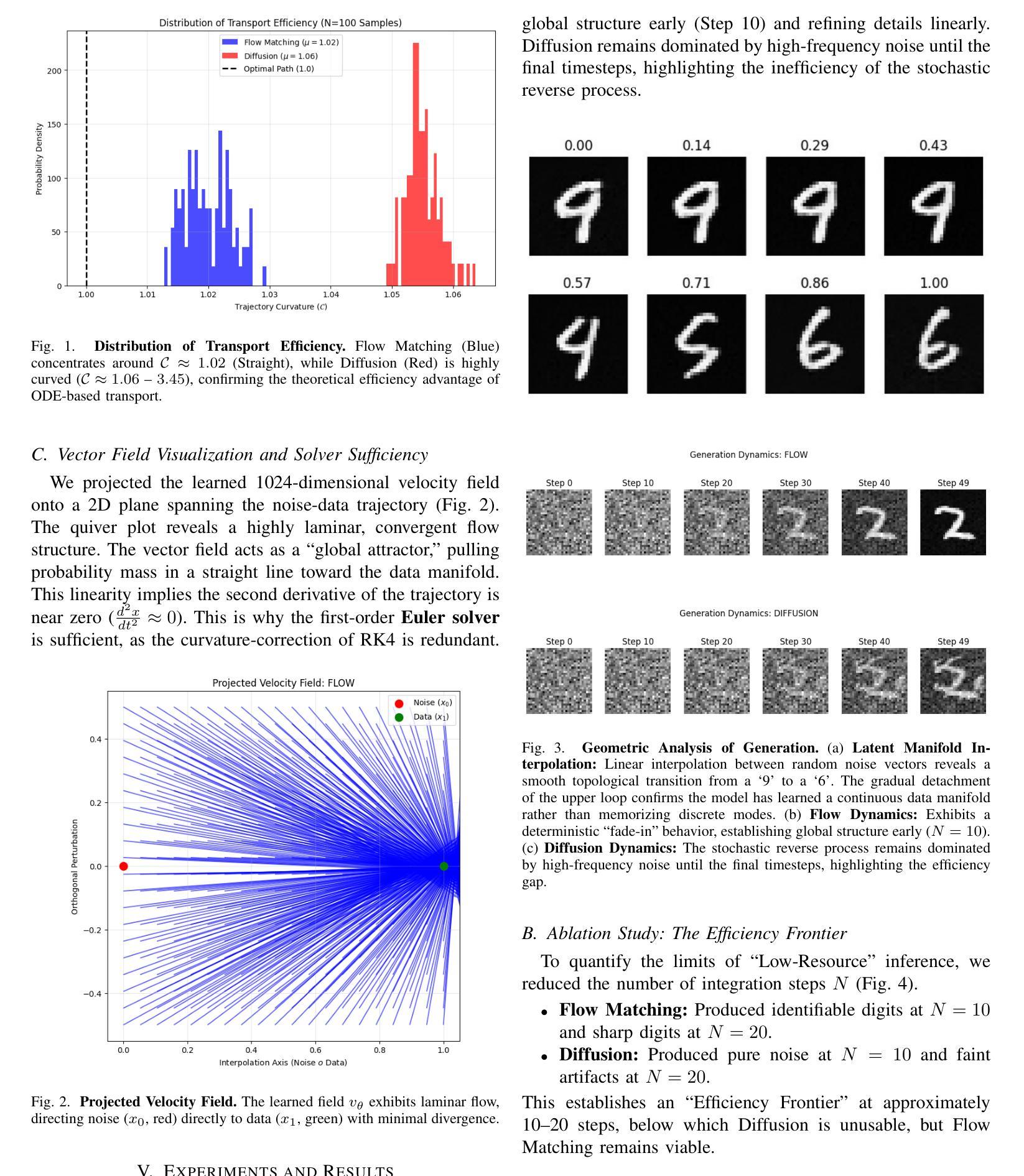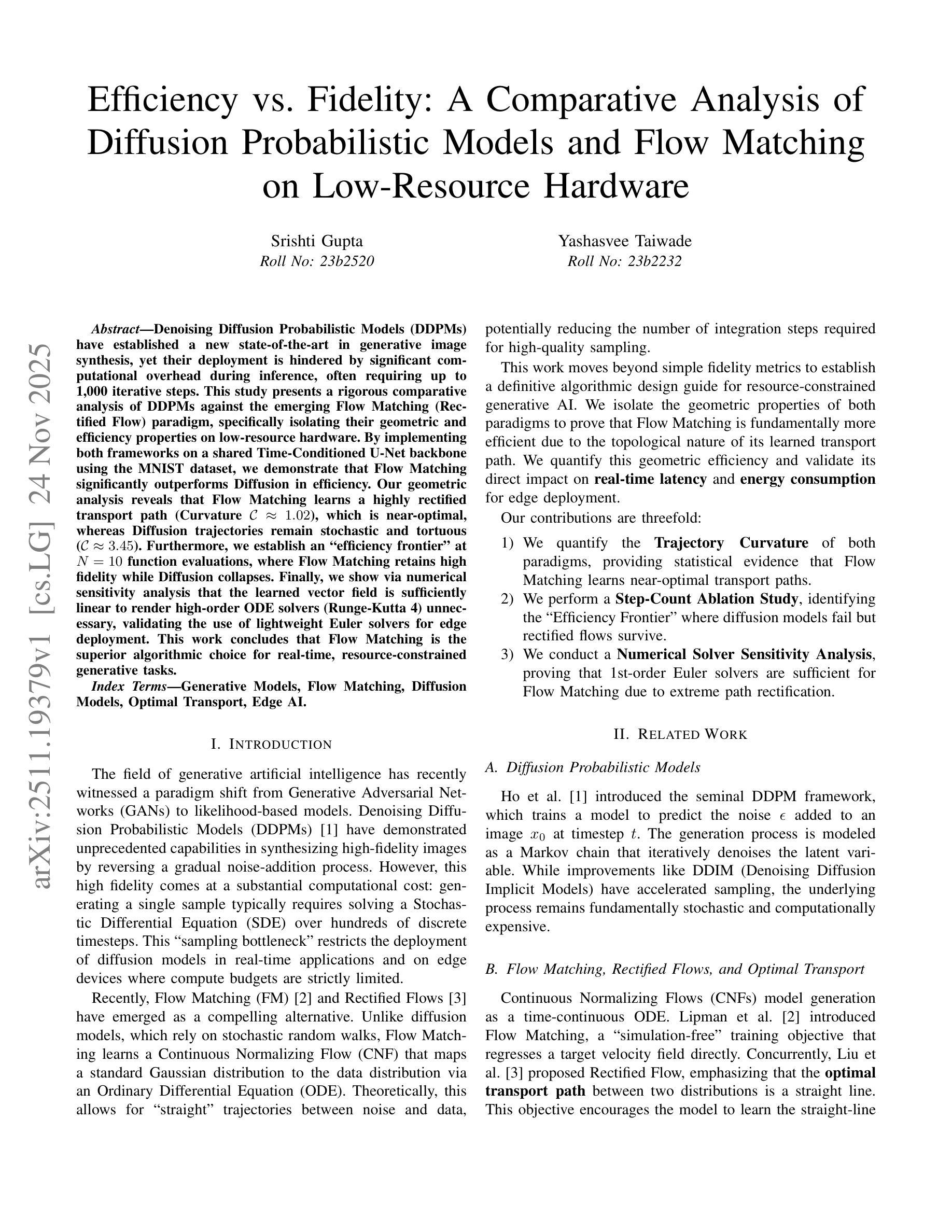 去噪扩散概率模型(DDPMs)已经在生成图像合成领域建立了最新的技术状态。然而,它们在推理过程中存在重大的计算开销,通常需要高达1000次的迭代步骤,这阻碍了其部署。本研究对DDPMs与新兴的流程匹配(校正流程)范式进行了严格的比较分析,特别是在低资源硬件上对其几何和效率属性进行了隔离。我们通过使用MNIST数据集在共享的时间条件U-Net主干上实现这两个框架,证明流程匹配在效率上显著优于扩散。我们的几何分析表明,流程匹配学习了一种高度校正的传输路径(曲率C≈1.02),这接近最优,而扩散轨迹仍然具有随机性和曲折性(C≈3.45)。此外,我们在函数评估N=10时建立了“效率前沿”,流程匹配保持高保真度,而扩散则崩溃。最后,我们通过数值敏感性分析表明,所学的向量场足够线性,无需使用高阶常微分方程求解器(如龙格-库塔法4),验证了使用轻量级欧拉求解器进行边缘部署的合理性。**本研究得出结论,流程匹配是适用于实时、资源受限生成任务的更优秀的算法选择。