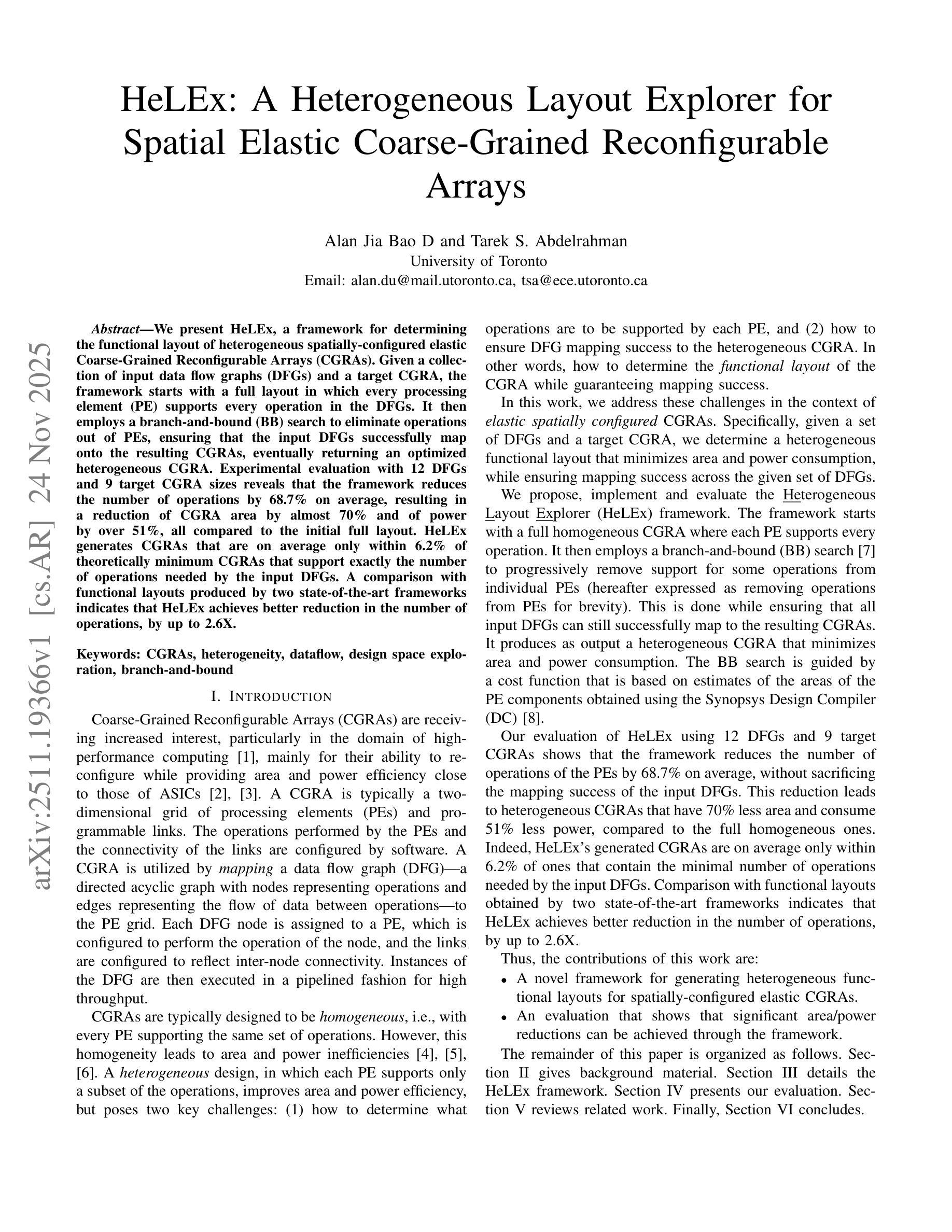 本文介绍了HeLEx框架,该框架用于确定异质空间配置弹性粗粒度可重构阵列(CGRAs)的功能布局。框架通过采用分支定界(BB)搜索,对输入数据流图(DFGs)进行优化,减少不必要的操作,实现CGRA的优化。实验表明,该框架平均减少了68.7%的操作,使得CGRA面积减少近70%,功耗降低超过51%。与现有两种先进框架比较,HeLEx在减少操作数方面表现更优,最多可达2.6倍。