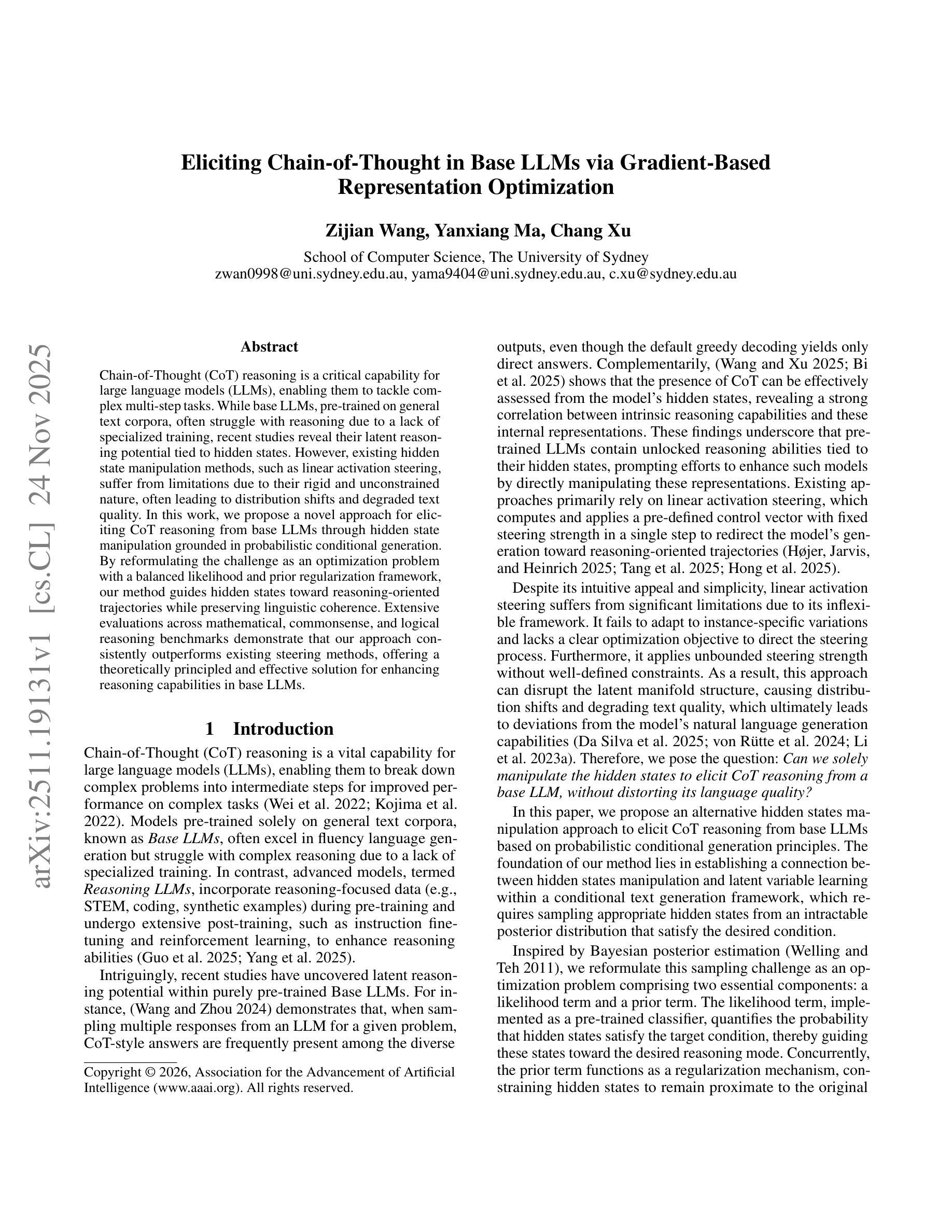 基于链式思维(CoT)推理是大型语言模型(LLM)的关键能力,使其能够应对复杂的多步骤任务。尽管基础LLM在一般文本语料库上进行预训练,但由于缺乏专门训练,它们通常面临推理困难。然而,最新研究表明其隐藏状态与潜在推理能力有关。然而,现有的隐藏状态操纵方法,如线性激活引导,由于它们固有的局限性和不受约束的特性,往往会导致分布偏移和文本质量下降。本研究提出了一种基于概率条件生成的新方法,通过隐藏状态操纵来激发基础LLM的CoT推理能力。通过将其重新表述为平衡可能性与先验正则化框架的优化问题,我们的方法引导隐藏状态走向推理导向轨迹,同时保持语言连贯性。在跨数学、常识和逻辑推理基准测试上的广泛评估表明,我们的方法持续优于现有引导方法,为增强基础LLM的推理能力提供了理论上有原则的有效解决方案。