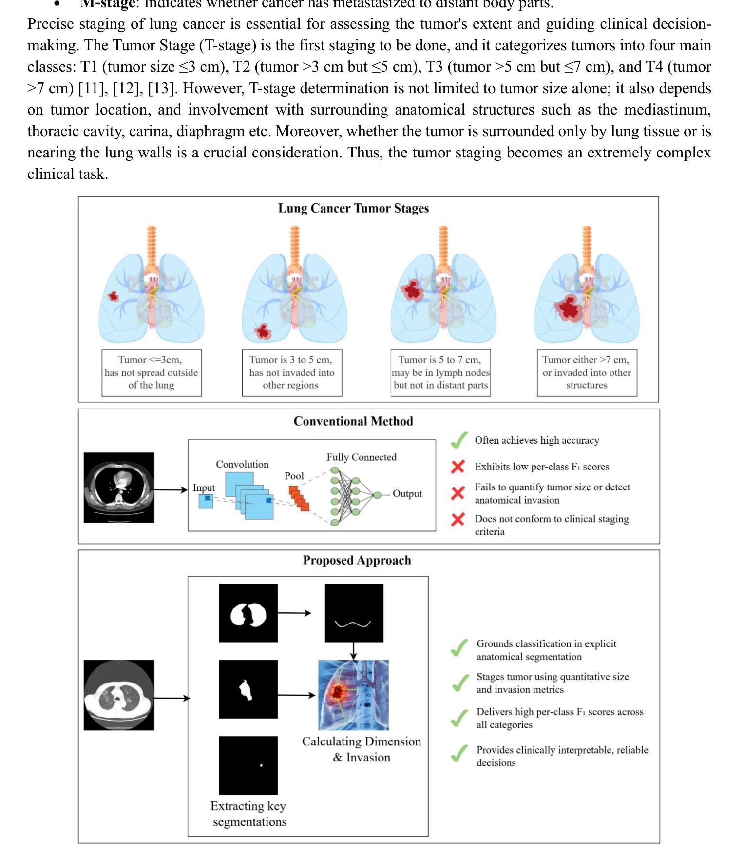 - 传统的端到端深度学习方法在肺癌分期上常忽略空间解剖信息,造成挑战。