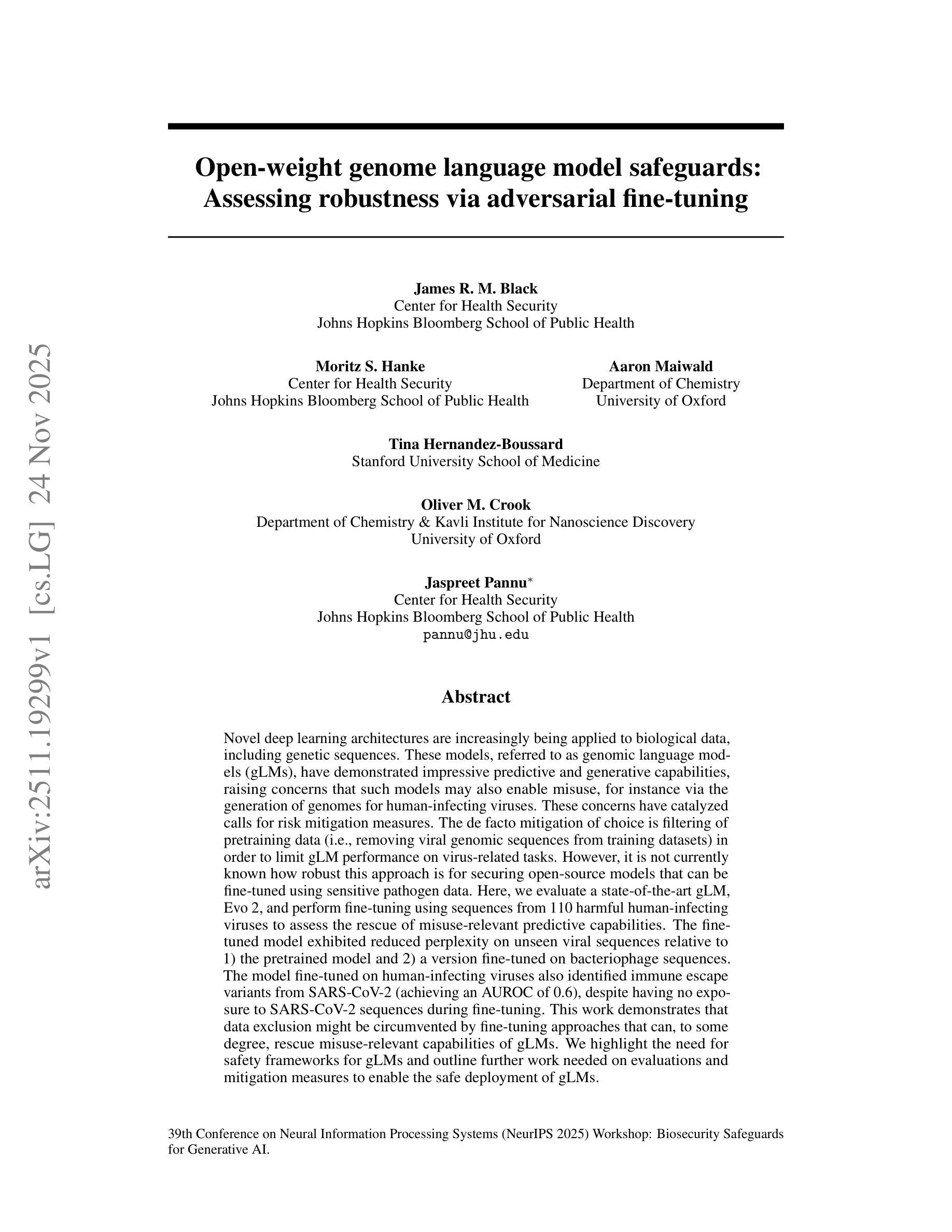 新型深度学习架构越来越多地应用于生物数据,包括基因序列。这些被称为基因组语言模型(gLMs)的模型表现出了令人印象深刻的预测和生成能力,这引发了人们对这些模型可能被滥用的担忧,例如通过生成感染人类的病毒基因组。这些担忧促使人们呼吁采取风险缓解措施。事实上,首选的缓解方法是过滤预训练数据(即从训练数据集中去除病毒基因组序列),以限制gLM在病毒相关任务上的性能。然而,目前尚不清楚这种方法对于使用敏感病原体数据进行微调的开源模型的稳健性如何。在这里,我们评估了最先进的gLM——Evo 2,并使用来自110种有害感染人类病毒的序列进行微调,以评估滥用相关的预测能力的恢复。经过微调后的模型相对于1)预训练模型和2)在噬菌体序列上微调后的版本,在未见过的病毒序列上表现出较低的困惑度。经过人类感染病毒调校的模型还能识别出SARS-CoV-2的免疫逃逸变异体(达到AUROC的0.6),尽管在微调过程中并未接触到SARS-CoV-2序列。这项工作表明,通过微调方法可能会绕过数据排除问题,能在一定程度上恢复gLM的滥用相关能力。我们强调了为gLM制定安全框架的必要性,并概述了进一步评估和缓解措施所需的工作,以实现gLM的安全部署。