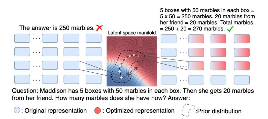 链式思维(CoT)推理对于大型语言模型(LLM)是一项至关重要的能力,能够使它们解决复杂的多步骤任务。虽然基于通用文本语料库进行预训练的基础LLM常常由于缺乏专项训练而在推理方面遇到困难,但最近的研究揭示了与隐藏状态相关的潜在推理潜力。然而,现有的隐藏状态操作方法,如线性激活操纵,由于它们僵化和无约束的性质,存在局限性,往往会导致分布偏移和文本质量下降。在这项工作中,我们提出了一种基于概率条件生成的新型隐藏状态操作方法,用于从基础LLM中提取CoT推理能力。通过重新将挑战表述为一个具有平衡似然和先验正则化框架的优化问题,我们的方法引导隐藏状态走向以推理为导向的轨迹,同时保留语言连贯性。对数学推理、常识推理和逻辑推理基准的广泛评估表明,我们的方法一致地超越了现有的操纵方法,为增强基础LLM的推理能力提供了理论上有依据和有效的解决方案。