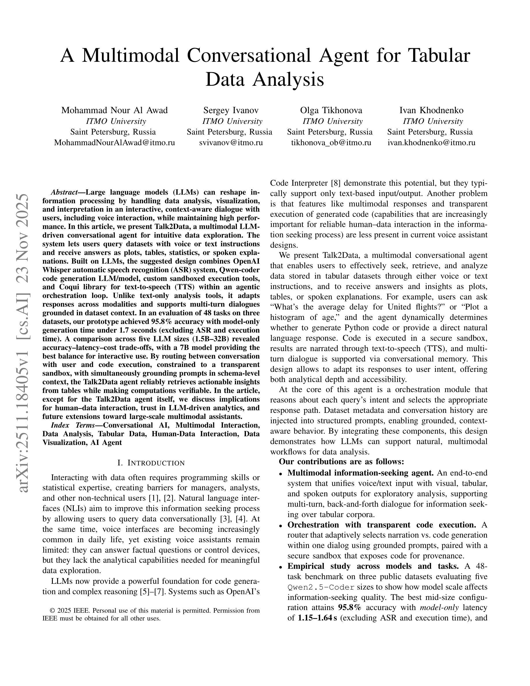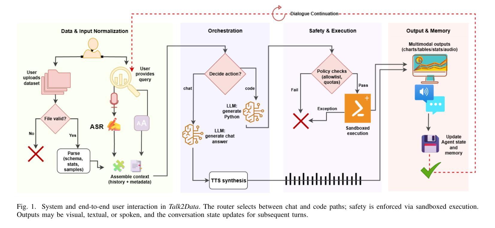大型语言模型(LLM)可以通过与用户进行交互式的、语境感知的对话来处理数据分析、可视化和解释,从而重塑信息处理能力,同时保持高性能。在本文中,我们介绍了Talk2Data,这是一个由多模态LLM驱动用于直观数据探索的对话代理。该系统让用户使用语音或文本指令查询数据集,并以图表、表格、统计数据或口头解释的形式接收答案。该系统基于LLM构建,结合了OpenAI的Whisper自动语音识别(ASR)系统、Qwen-coder的代码生成LLM/模型、自定义的沙箱执行工具和Coqui文本到语音(TTS)库,在一个代理编排循环中运行。与传统的仅文本分析工具不同,它适应跨模态的响应,并支持基于数据集上下文的多轮对话。在三个数据集上的48项任务评估中,我们的原型达到了95.8%的准确率,仅模型生成时间不到1.7秒(不包括ASR和执行时间)。对五个不同规模LLM(1.5B-32B)的比较揭示了准确性、延迟和成本之间的权衡,其中7B模型在交互式使用方面提供了最佳平衡。通过在用户对话与代码执行之间进行路由选择,被限制在一个透明的沙箱中,同时根据模式级别的上下文来提示基础,Talk2Data代理能够可靠地从表格中提取可操作的见解,同时使计算可验证。在本文中,除了Talk2Data代理本身,我们还讨论了人类与数据交互的启示、对LLM驱动分析的可信性以及未来向大规模多模态助理扩展的方向。