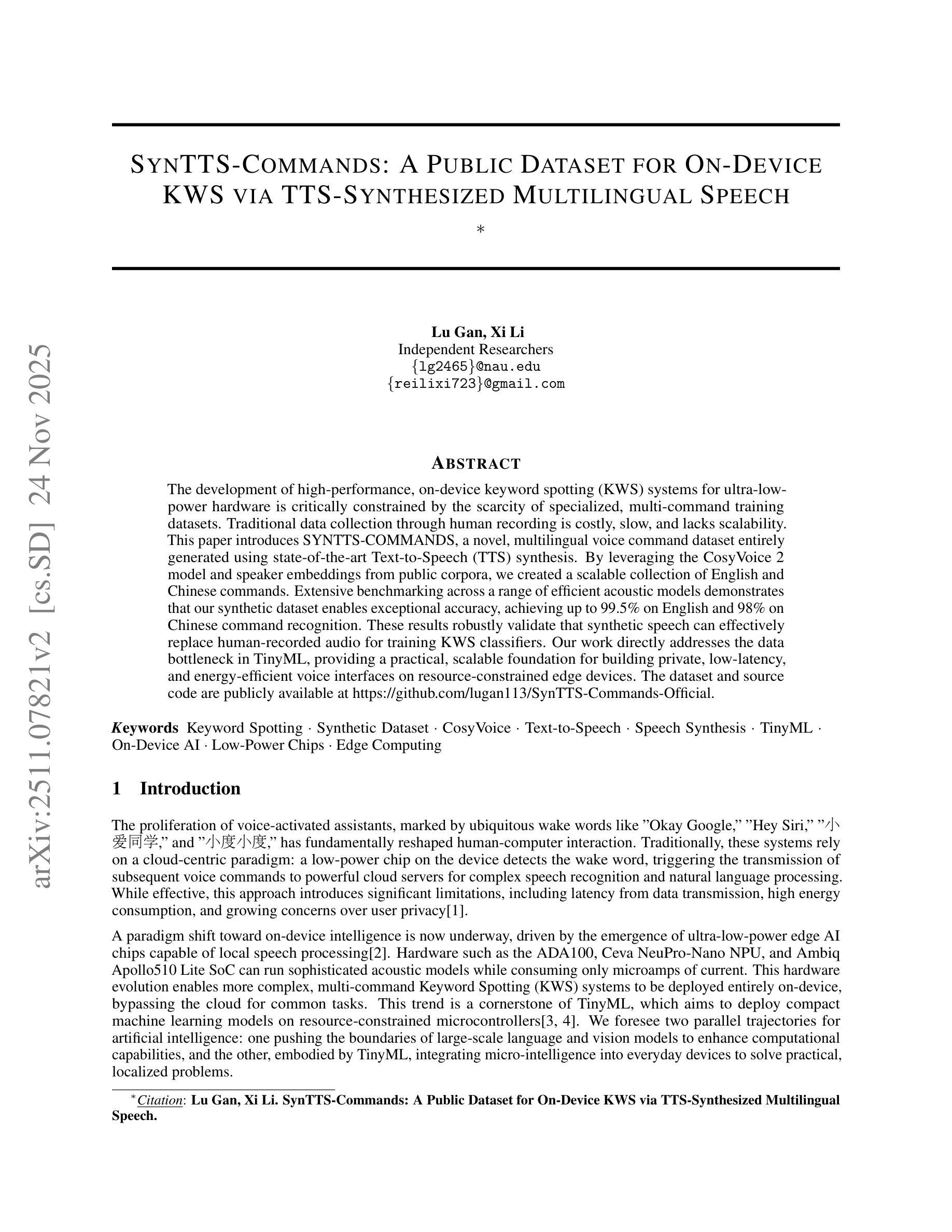 高性能设备端关键词识别(KWS)系统在超低功耗硬件上的发展受到了特定多命令训练数据集稀缺的严重制约。传统通过人工录制的数据收集方式成本高昂、速度缓慢且缺乏可扩展性。本文介绍了SYNTTS-COMMANDS,一种全新多语言语音命令数据集,完全使用最先进的文本到语音(TTS)合成生成。我们通过利用CosyVoice 2模型和公共语料库的说话人嵌入,创建了一个可扩展的英语和中文命令集合。在一系列高效的声学模型上的广泛基准测试表明,我们的合成数据集能够实现出色的准确性,英语命令识别率高达99.5%,中文命令识别率达98%。这些结果稳健地验证了合成语音可以有效地替代人工录音,用于训练KWS分类器。我们的工作直接解决了TinyML中的数据瓶颈问题,为在资源受限的边缘设备上构建私密、低延迟和节能的语音接口提供了实用且可扩展的基础。数据集和源代码可在https://github.com/lugan113/SynTTS-Commands-Official获取。