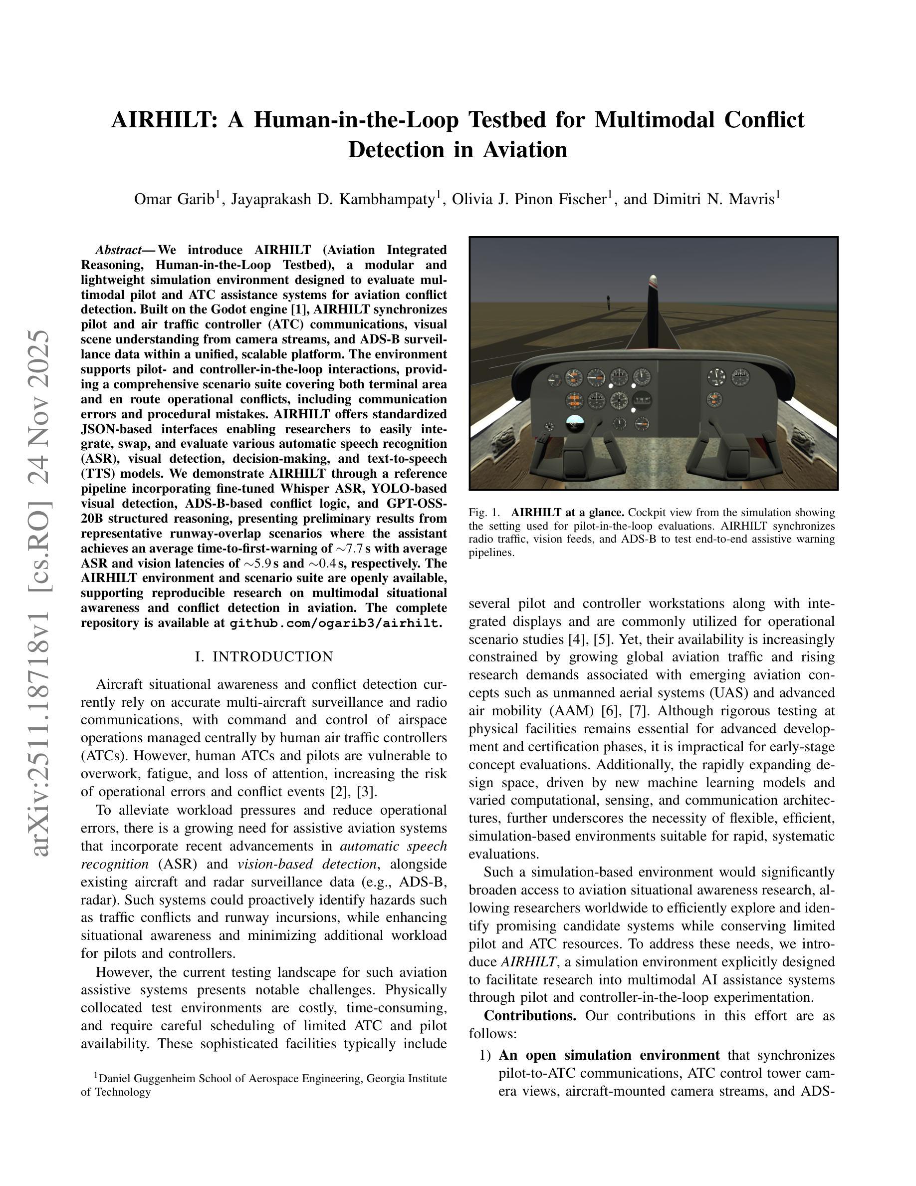 我们介绍了AIRHILT(航空综合推理、人机循环测试平台),这是一个模块化且轻量级的仿真环境,旨在评估航空冲突检测的飞行员和空中交通管制(ATC)辅助系统的多模式功能。AIRHILT建立在开源的Godot引擎之上,同步飞行员和ATC的无线电通信、来自摄像头流的视觉场景理解以及ADS-B监控数据在一个统一、可扩展的平台内。该环境支持飞行员和控制器循环交互,提供了一个全面的场景套件,涵盖终端区域和航路操作冲突,包括通信错误和程序错误。AIRHILT提供了基于标准化的JSON接口,使研究人员能够轻松集成、交换和评估自动语音识别(ASR)、视觉检测、决策和文本到语音(TTS)模型。我们通过参考管道展示了AIRHILT,该管道结合了经过微调后的Whisper ASR、基于YOLO的视觉检测、基于ADS-B的冲突逻辑和GPT-OSS-20B结构化推理,并展示了来自典型跑道重叠场景的初步结果,其中助理的平均首次警告时间为约7.7秒,ASR和视觉的平均延迟时间分别为约5.9秒和0.4秒。AIRHILT环境和场景套件公开可用,支持航空多模式态势感知和冲突检测的复现研究;代码和场景可在https://github.com/ogarib3/airhilt找到。