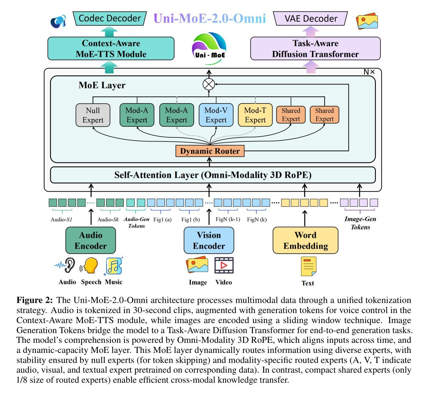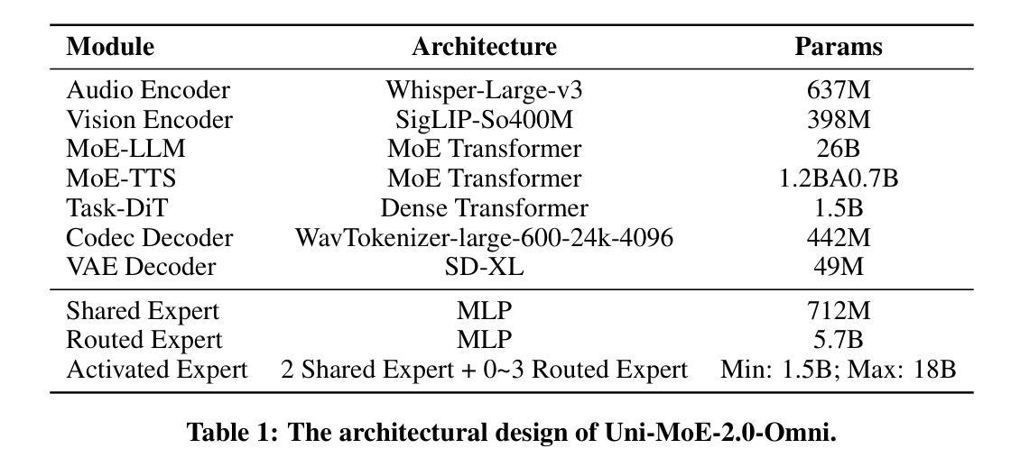 我们推出了来自Lychee家族的Uni-MoE 2.0。作为一款完全开源的多模态大型模型(OLM),它极大地推动了Lychee的Uni-MoE系列在语言为中心的多模态理解、推理和生成方面的进展。基于密集LLM,我们通过三个核心贡献从头构建Uni-MoE-2.0-Omni:动态容量混合专家(MoE)设计,增强迭代强化策略的渐进训练策略,以及精心策划的多模态数据匹配技术。它能够实现多模态理解,并生成图像、文本和语音。在结构上,我们新的MoE框架通过共享、路由和空专家在10个跨模态输入之间平衡计算效率和功能;我们的Omni-Modality 3D RoPE确保自注意力层中的时空跨模态对齐。在训练方面,我们在跨模态预训练之后采用渐进的监督微调策略,该策略激活特定于模态的专家,并通过平衡数据组合和迭代GSPO-DPO方法来稳定强化学习训练和提升推理能力。从数据角度看,基础模型在大约75B个开源多模态数据标记上进行训练,并配备了特殊的语音和图像生成令牌,这使其能够通过语言线索来生成这些生成任务的条件输出。在85个基准测试上的广泛评估表明,我们的模型达到了最新水平或在对领先OLM的竞争性能中具有高度竞争力,在超过50个基准测试中超过了使用1.2T令牌训练的Qwen2.5-Omni。主要优势包括视频理解(+平均提升7%),多模态理解(+平均提升7%)和视听推理(+平均提升4%)。它还推动了长形式语音处理(降低WER 4.2%)并在低级别图像处理和控制生成方面领先其他指标在五个指标上占据领先地位。