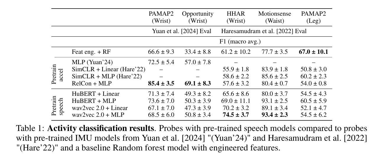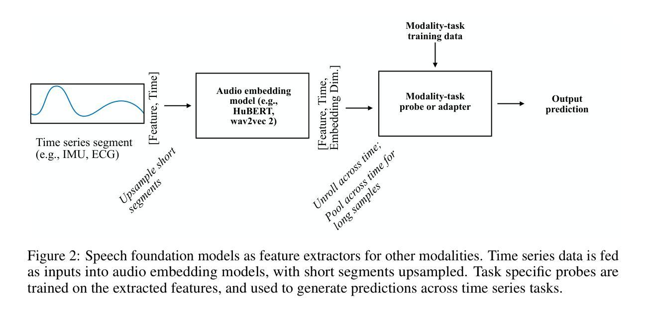 语音和传感器时间序列数据在时间和频率域中都编码信息,如谱功率和波形形状。我们展示语音基础模型学习到的表征能够推广到语音领域之外,并在多样化的时间序列任务上实现了卓越的性能,这些任务来自可穿戴传感器。使用HuBERT和wav2vec 2.0提取的特征训练的探测器,在情绪分类、心律失常检测和活动分类任务上的表现超过了直接从特定模态数据集上训练的自我监督模型提取的特征。我们发现语音模型的卷积特征编码器对于可穿戴传感器应用特别重要。所提出的方法使用简单的探测方法提高了数据稀缺时间序列任务的性能。这项工作朝着开发统一语音和传感器模态的通用时间序列模型迈出了一步。