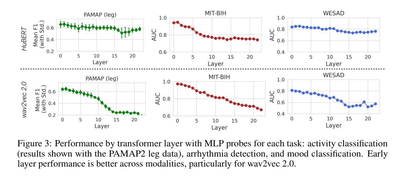 - 与直接在特定数据集上训练的自我监督模型相比,基于语音模型提取的特征在情绪分类、心律失常检测和运动分类任务上的表现更优。