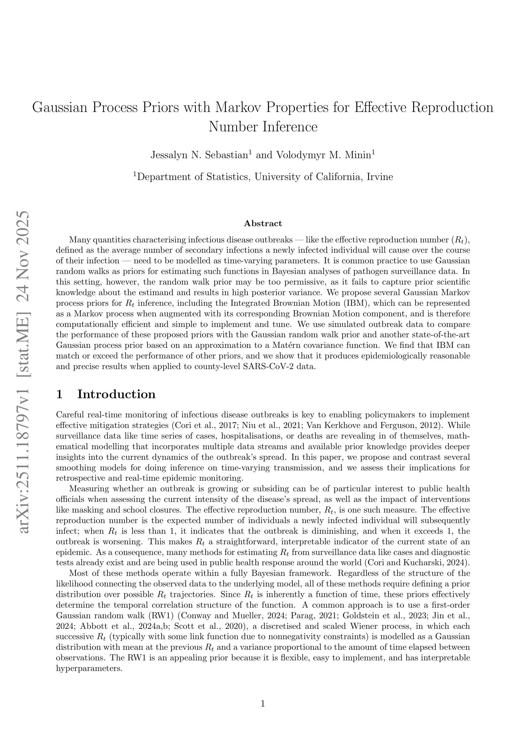 描述传染病爆发特征的许多数量,如有效繁殖数($R_t$),定义为新感染个体在其感染过程中将引发的继发性感染的平均数量,需要被建模为随时间变化的参数。在病原体监测数据的贝叶斯分析中,使用高斯随机游走作为估计此类函数的先验概率是一种常见的做法。然而,在这种情况下,随机游走先验可能过于宽松,因为它未能捕捉到关于估计量的先前科学知识,并导致较高的后验方差。我们为$R_t$推断提出了几种高斯马尔可夫过程先验,包括综合布朗运动(IBM),当其与相应的布朗运动分量结合时,可以表示为马尔可夫过程,因此计算效率高,易于实施和调整。我们使用模拟的爆发数据来比较这些提议的先验与高斯随机游走先验和基于马特恩协方差函数近似值的最新高斯过程先验的性能。我们发现IBM可以匹配或超越其他先验的性能,并且我们展示了它应用于县级SARS-CoV-2数据时能产生流行病学的合理和精确结果。