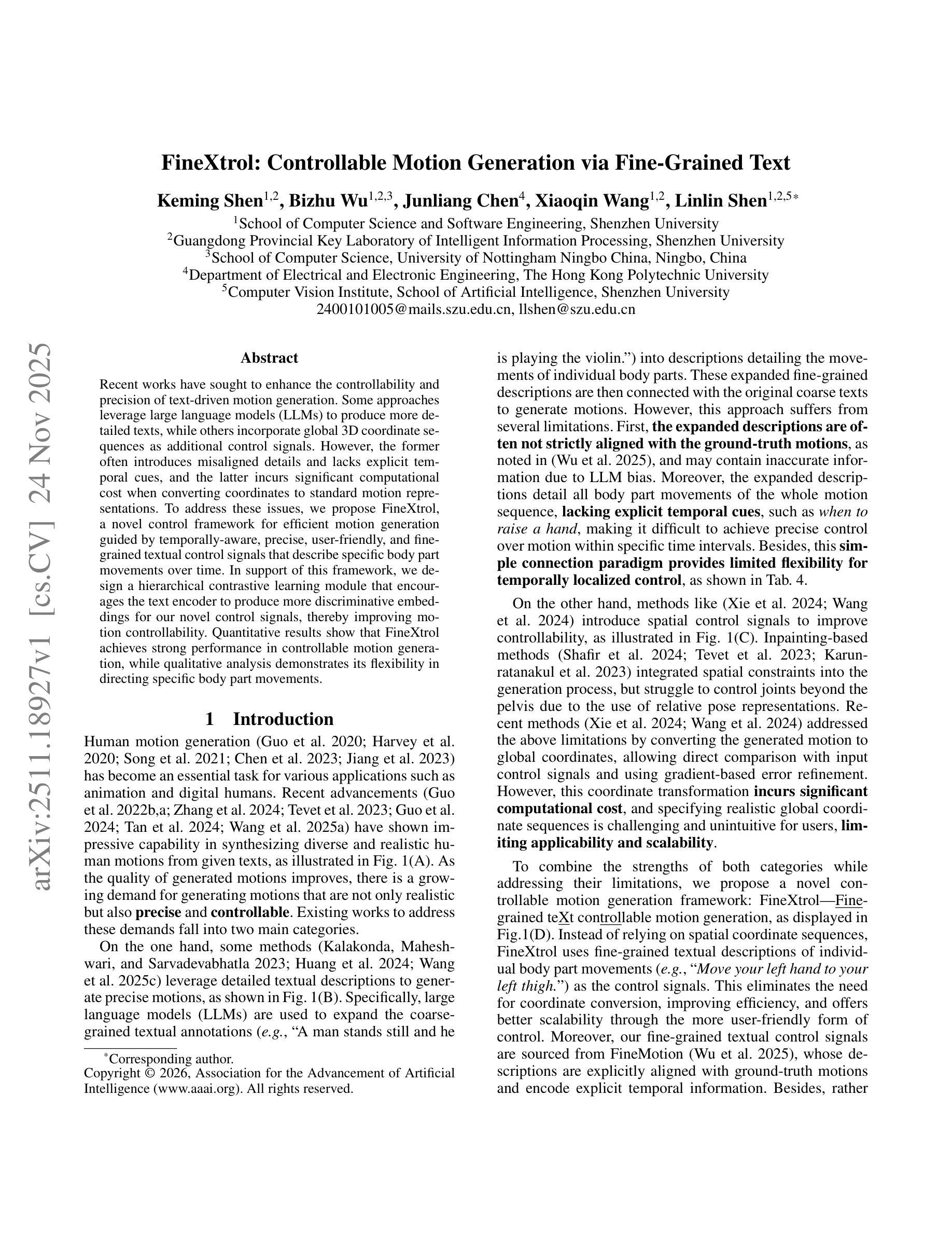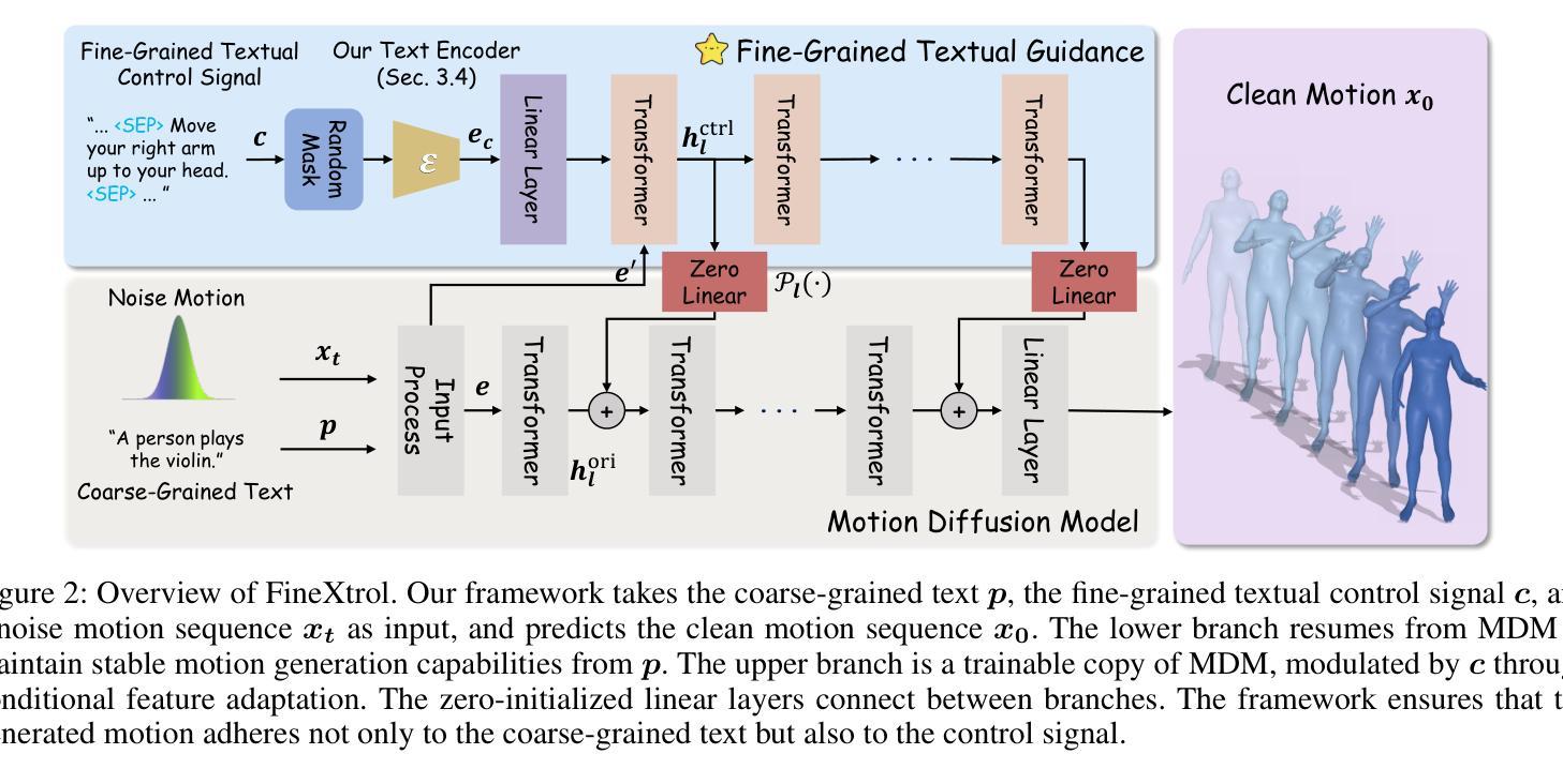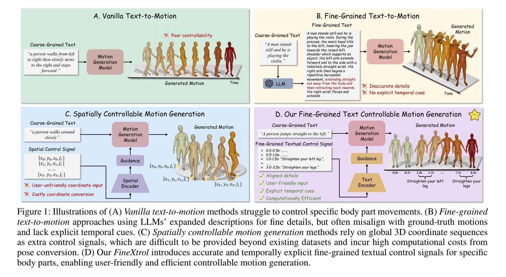 文本提出了一种名为FineXtrol的新型运动控制框架,用于由精确、具有时间感知能力且用户友好的文本控制信号引导的高效运动生成。该框架解决了现有方法中的一些问题,如大型语言模型产生的细节不匹配和全球三维坐标序列作为控制信号带来的计算成本问题。为解决这些问题,设计了一种层次对比学习模块,促使文本编码器产生更多具有鉴别力的嵌入,从而提高运动控制性能。定量和定性结果均表明,FineXtrol在可控运动生成方面表现出色,并能灵活指导特定身体部位的移动。