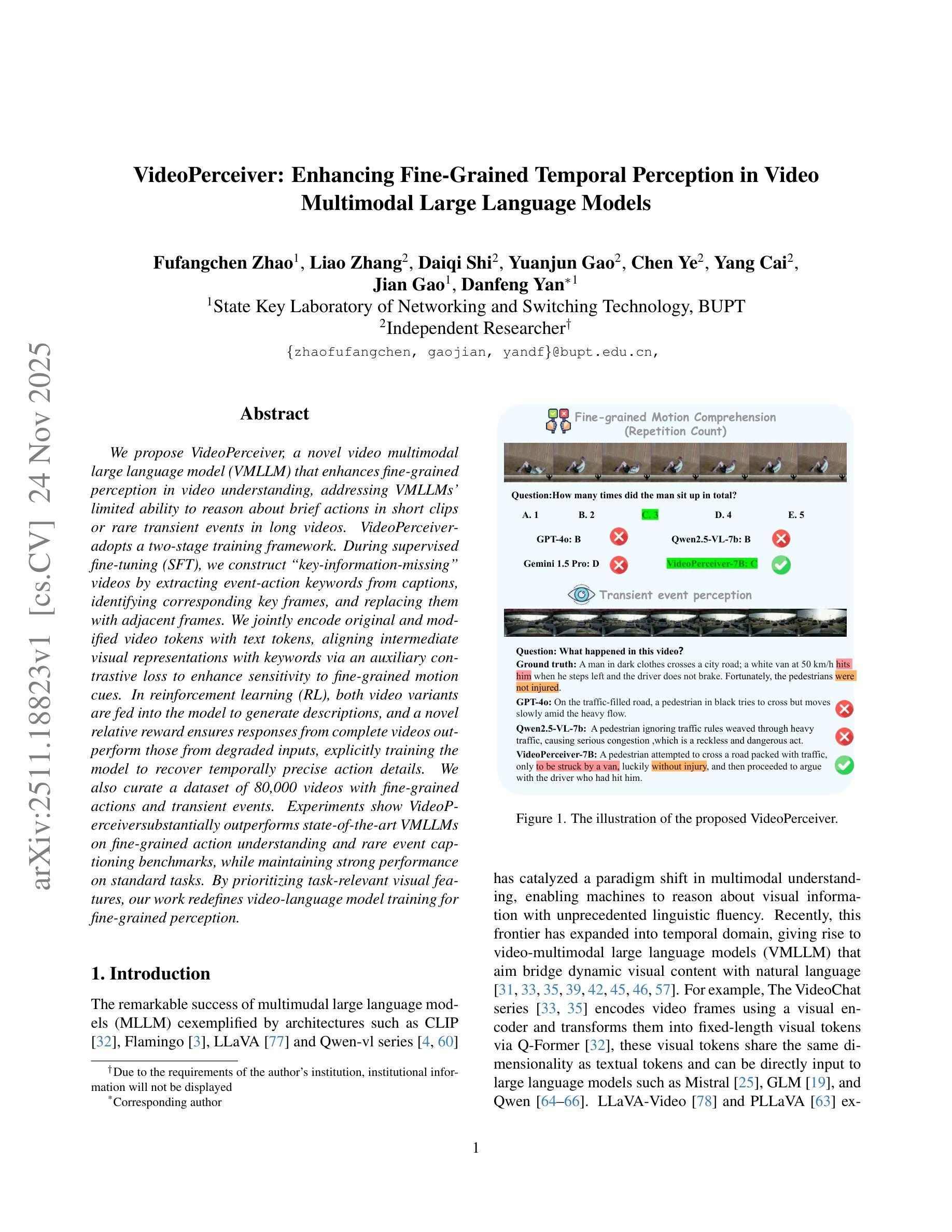 我们提出了VideoPerceiver,这是一种新型的视频多模态大型语言模型(VMLLM),旨在提高视频理解中的精细感知能力,解决VMLLM在短视频中的短暂行为或长视频中的罕见即时事件的推理能力有限的问题。VideoPerceiver采用了两阶段训练框架。在监督微调(SFT)期间,我们通过从字幕中提取事件动作关键词、识别相应的关键帧并将其替换为相邻帧,来构建“缺少关键信息”的视频。我们联合编码原始和修改后的视频令牌与文本令牌,通过辅助对比损失将中间视觉表示与关键词对齐,以提高对精细运动线索的敏感性。在强化学习(RL)中,将两种视频变体都输入模型以生成描述,一种新型相对奖励确保来自完整视频的响应优于来自退化输入的响应,从而明确训练模型以恢复时间精确的动作细节。我们还整理了一个包含8万条带有精细动作和即时事件视频的数据集。实验表明,VideoPerceiver在精细动作理解和罕见事件描述基准测试上显著优于最新VMLLM,同时在标准任务上保持强劲性能。通过优先处理与任务相关的视觉特征,我们的工作重新定义了用于精细感知的视频语言模型训练。