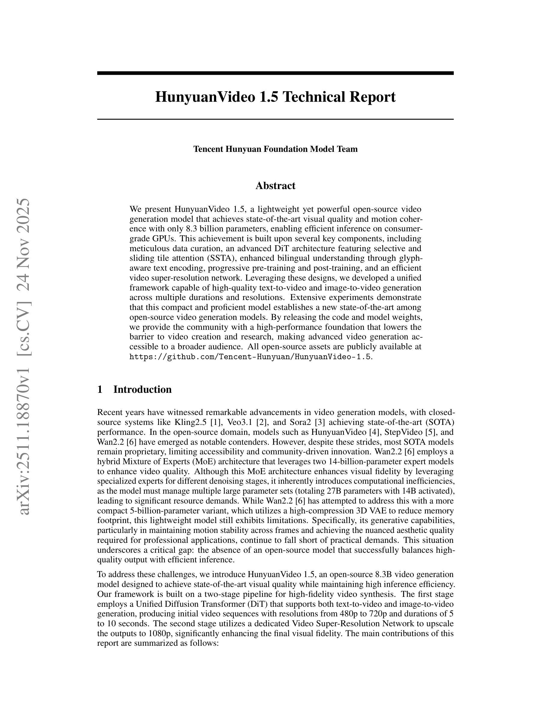 我们推出HunyuanVideo 1.5,这是一款轻便且强大的开源视频生成模型。它仅包含8.3亿个参数,即可实现最先进的视觉质量和运动连贯性,能在消费级GPU上进行高效推理。这一成就建立在几个关键组件之上,包括精心策划的数据集、带有选择性滑动瓷砖注意力(SSTA)的高级DiT架构、通过字形感知文本编码增强双语理解、渐进的预训练和微调,以及高效的视频超分辨率网络。凭借这些设计,我们开发了一个统一框架,能够在多个持续时间和分辨率上实现高质量文本到视频和图像到视频的生成。大量实验表明,这款紧凑且专业的模型在开源视频生成模型中建立了新的最先进的水平。我们通过公开代码和模型权重,为社区提供了一个高性能的基础,降低了视频创作和研究的门槛,使先进的视频生成技术为更广泛的受众所使用。所有开源资产均可在[https://github.com/Tencent-Hunyuan/HunyuanVideo-1.5公开获取。