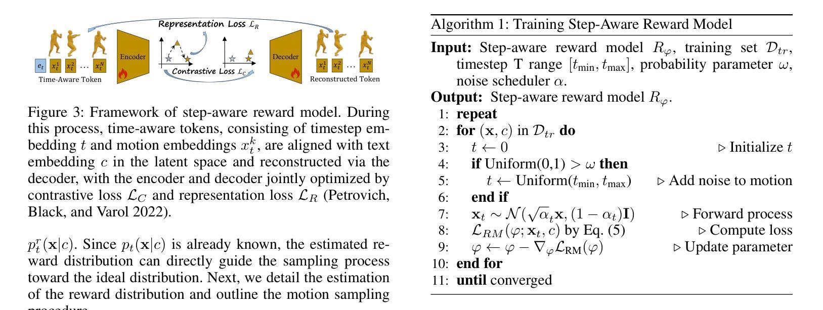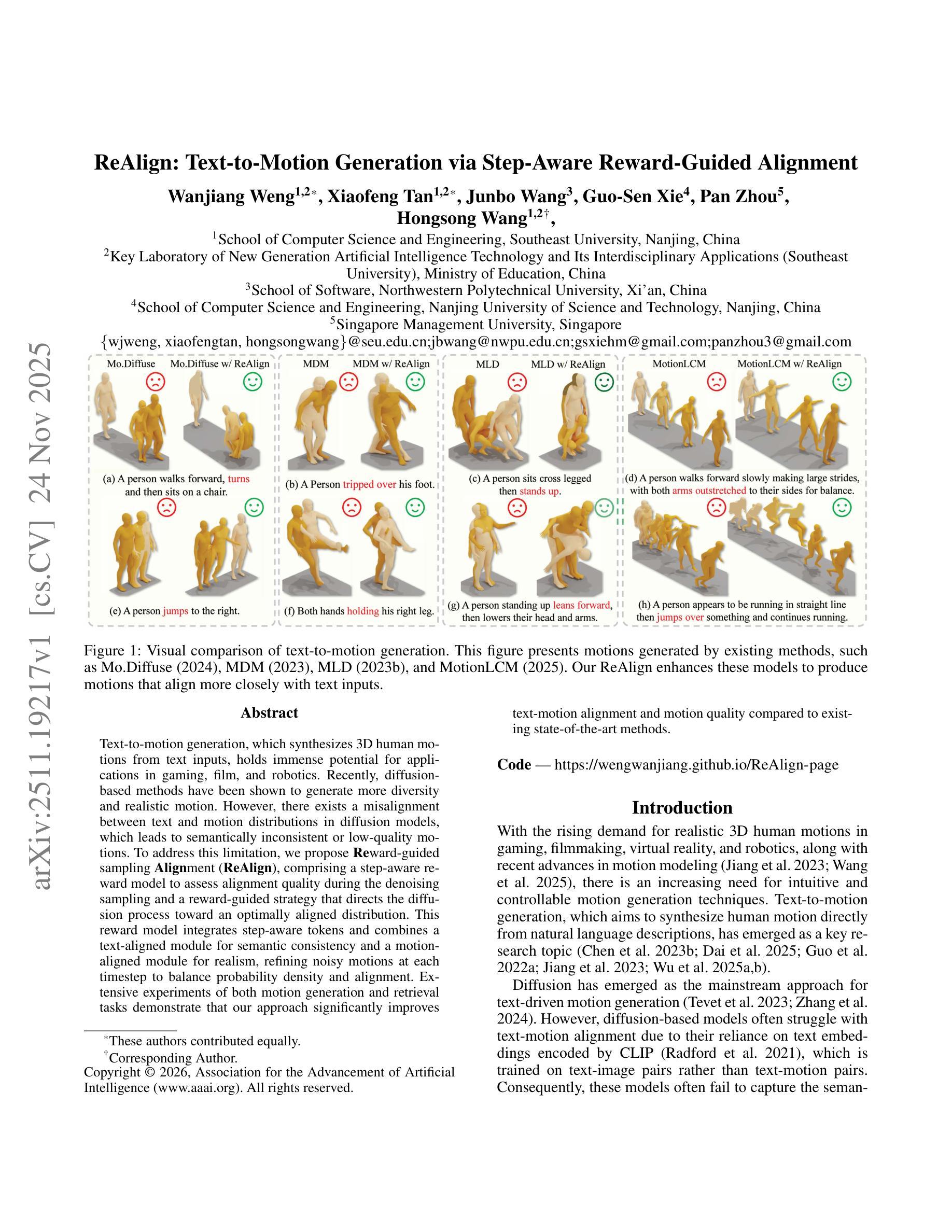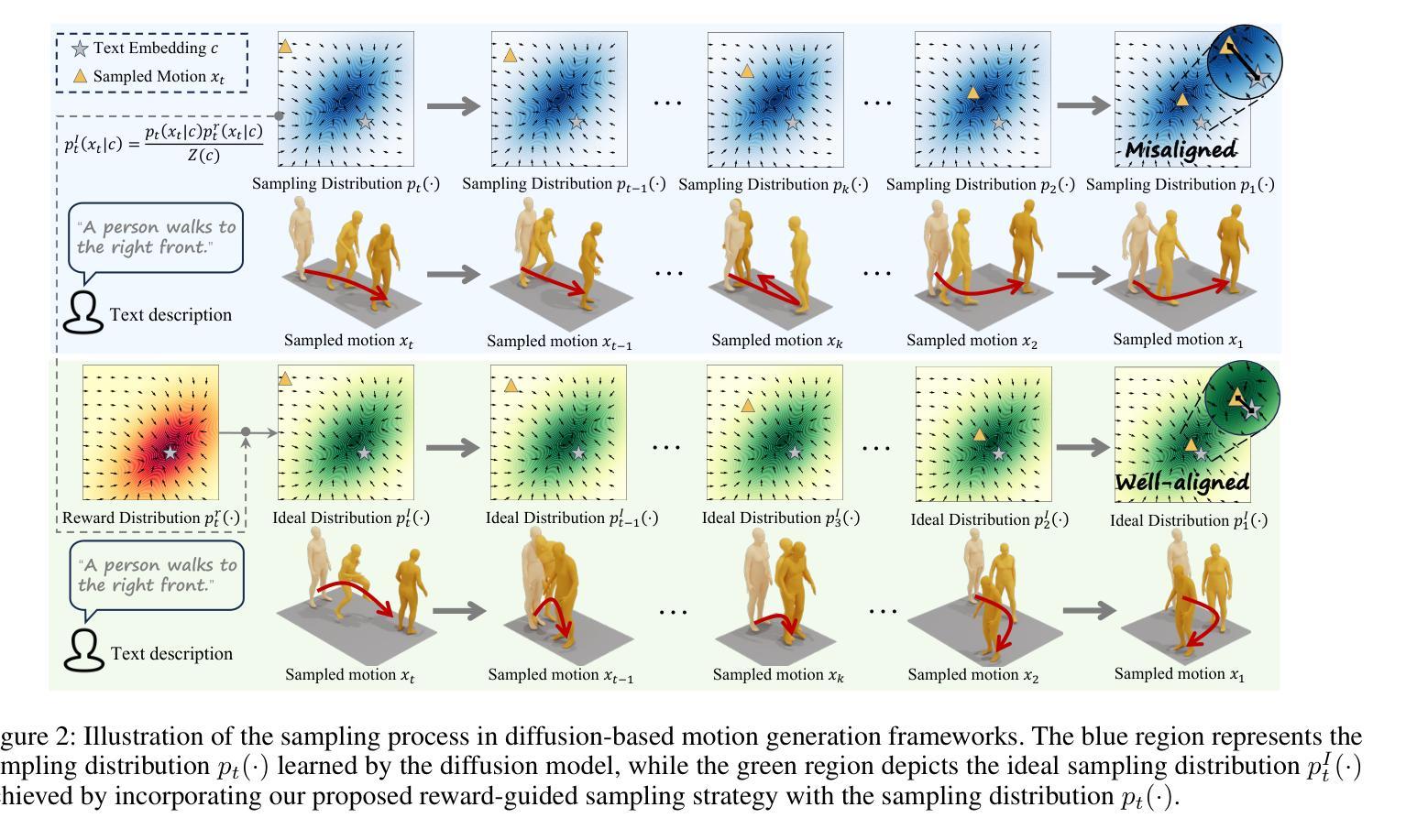 文本到动作生成技术通过文本输入合成3D人类动作,在游戏、电影和机器人等领域具有巨大潜力。最近,基于扩散的方法被证明可以生成更多样化和更逼真的动作。然而,扩散模型中文本和动作分布之间存在不对齐的问题,这会导致语义不一致或质量低的动作。为了解决这一局限性,我们提出了奖励引导采样对齐(ReAlign)方法,包括一个步骤感知奖励模型,在降噪采样过程中评估对齐质量,以及一个奖励引导策略,引导扩散过程朝最优对齐分布进行。该奖励模型结合了步骤感知令牌,并融合了文本对齐模块(用于语义一致性)和运动对齐模块(用于逼真度),在每个时间步对噪声动作进行微调,以平衡概率密度和对齐。对动作生成和检索任务的广泛实验表明,我们的方法在文本-动作对齐和动作质量方面显著优于现有最先进的方法。