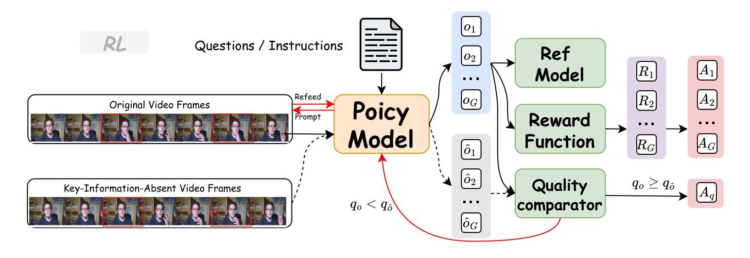 - 在强化学习阶段,通过相对奖励确保完整视频的响应优于退化输入,从而明确训练模型以恢复时间精确的动作细节。