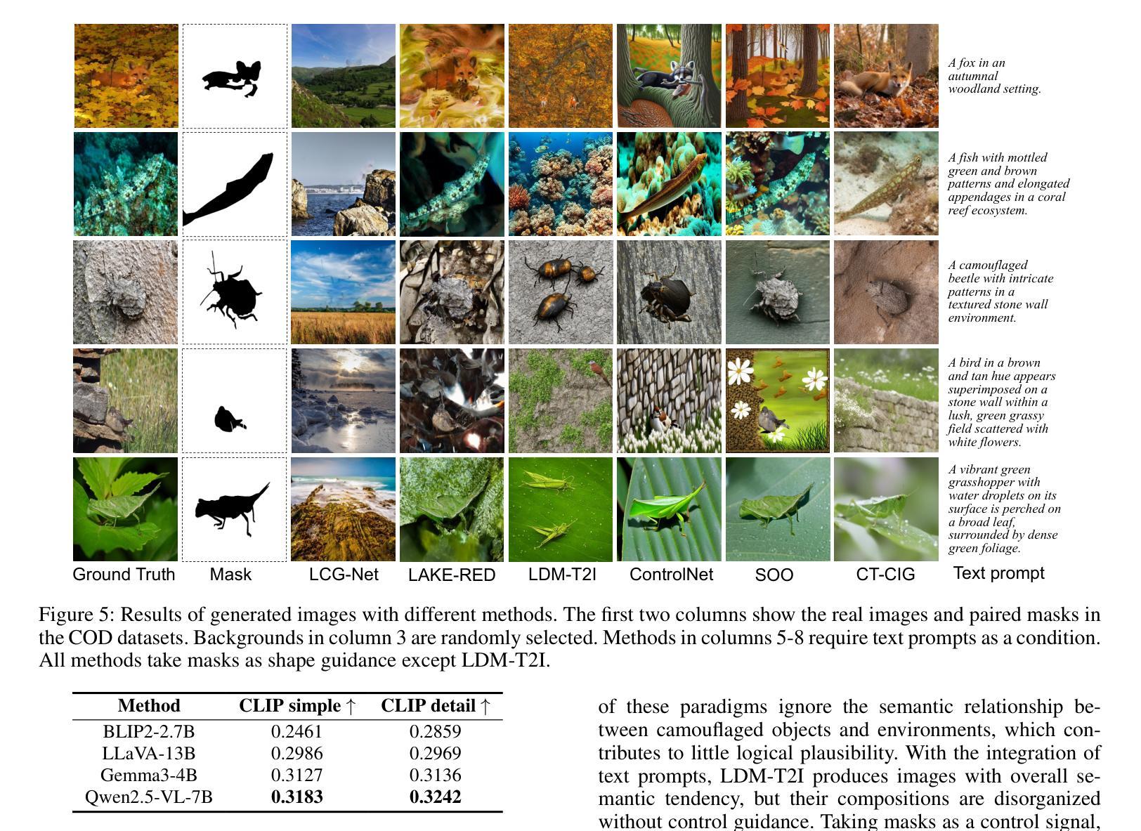 - 实验结果表明,CT-CIG能够生成语义对齐且光感逼真的伪装图像。