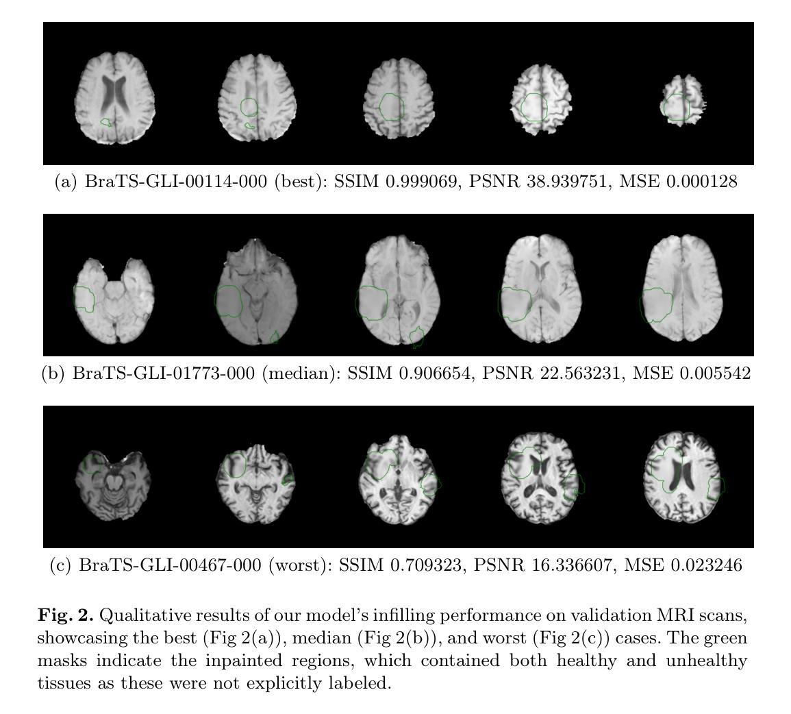 - 在最终测试集上,该方法性能卓越,获得BraTS-Inpainting 2025挑战第一名。